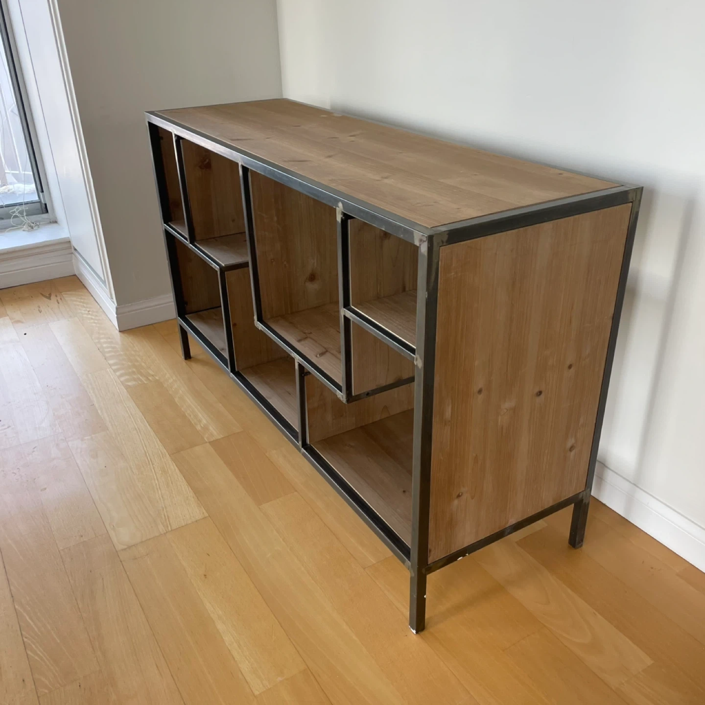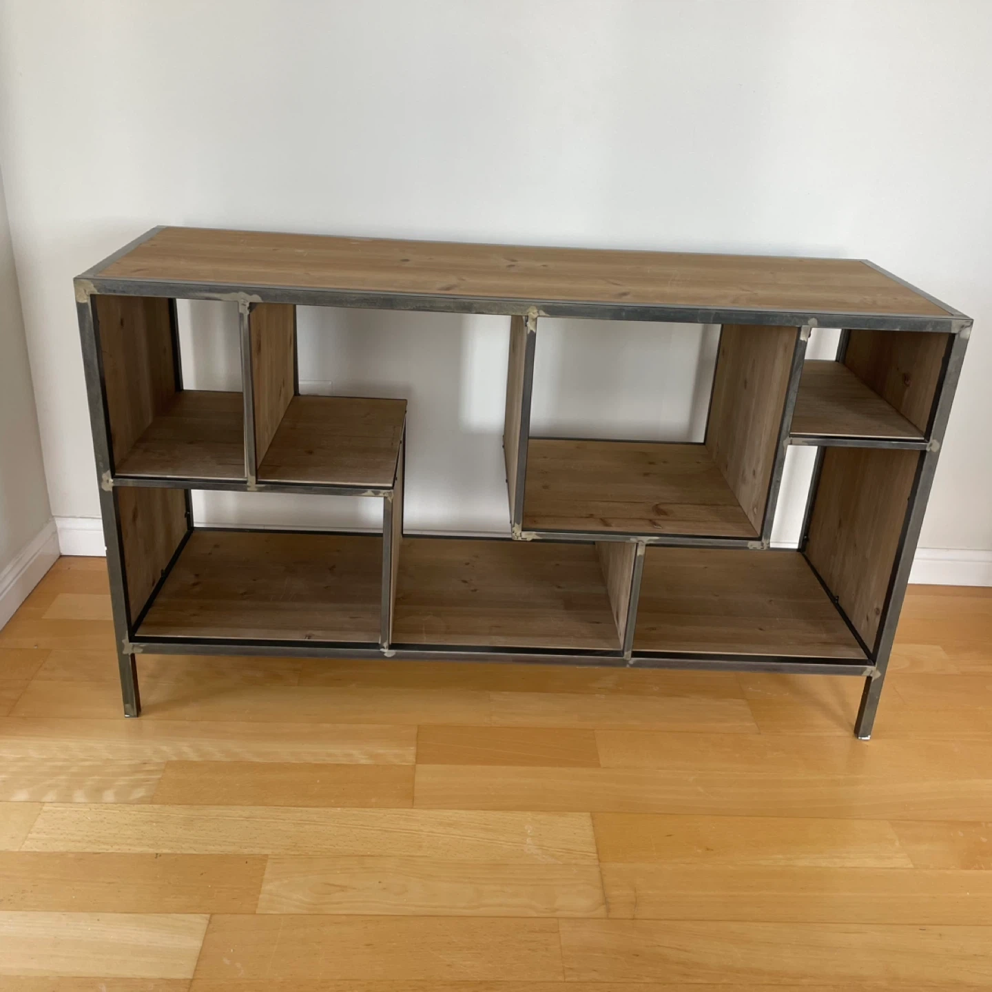 Open shelf sideboard console table unit shelves cupboard featuring wood shelving and a metal frame. It's designed with staggered compartments for a unique look. This piece offers ample storage and display space. Perfect condition. 120 length x 40 width x 70 height (cm)