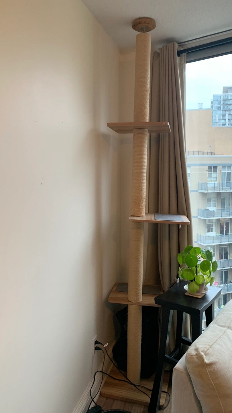 Elegant floor to ceiling cat tree, great for climbers. Poles are good for scratching too