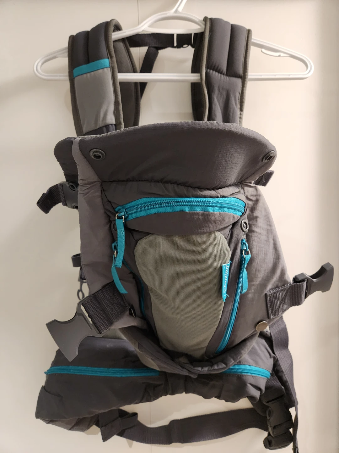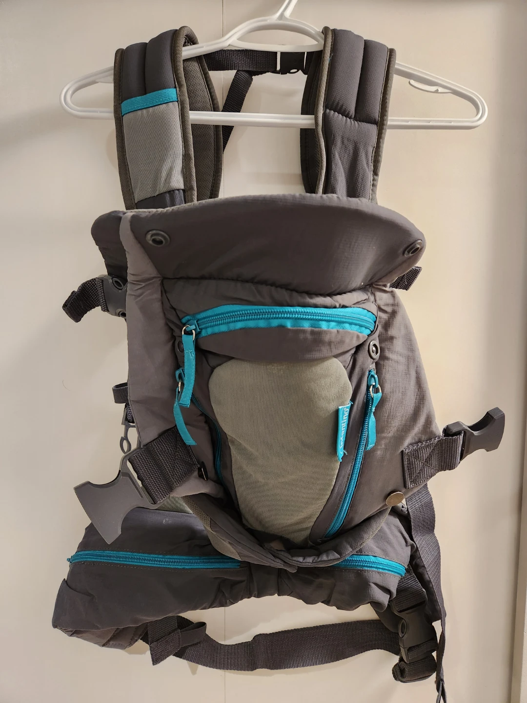 This is an Infantino baby carrier in grey and teal. It's made of durable fabric with multiple zippered pockets for storage. It has adjustable straps for a comfortable fit.