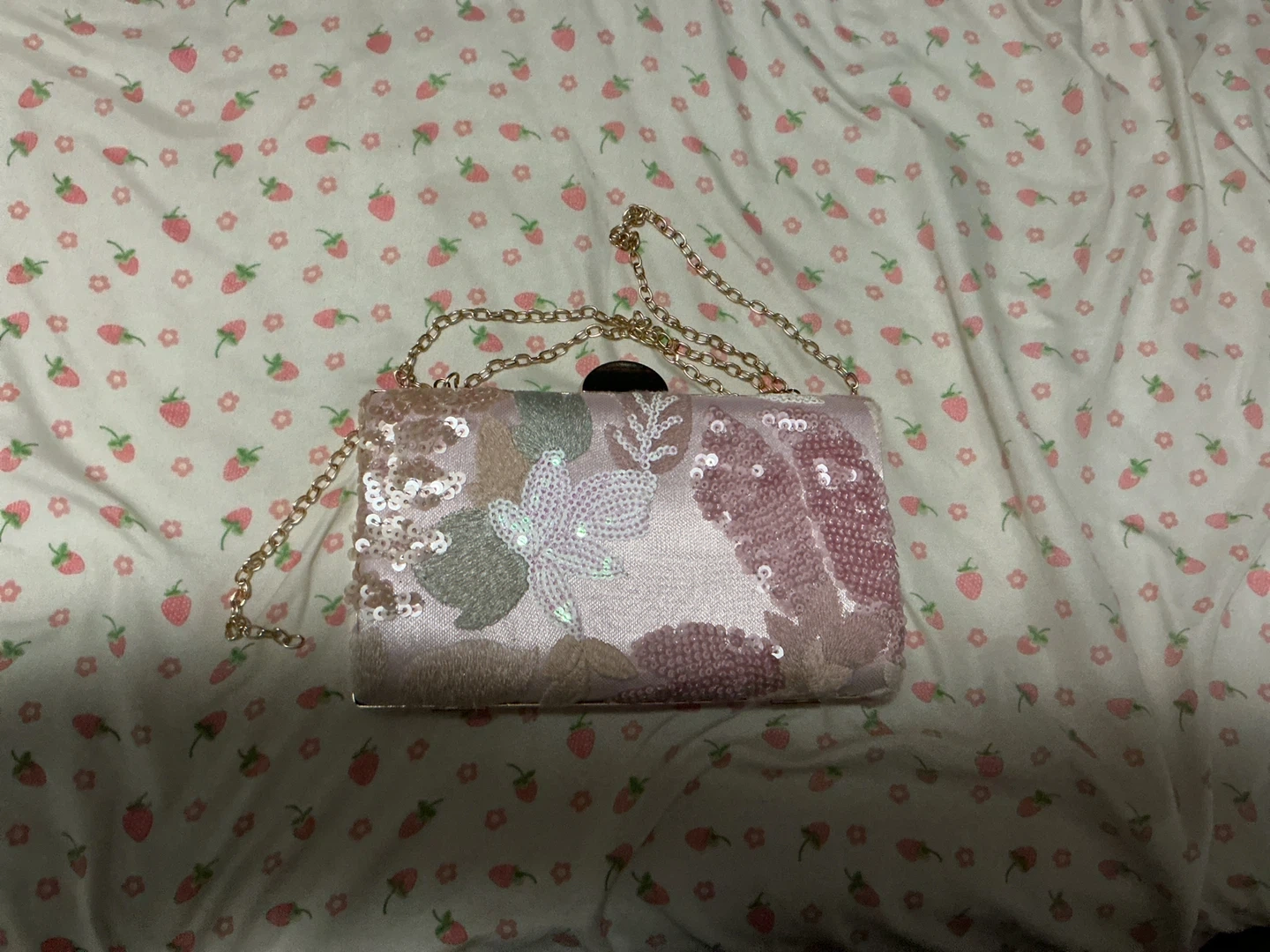 Sparkly pink and floral sequin clutch purse. It features a detachable gold-tone chain strap. This clutch adds a touch of glamour to any outfit! Wore once to prom.
