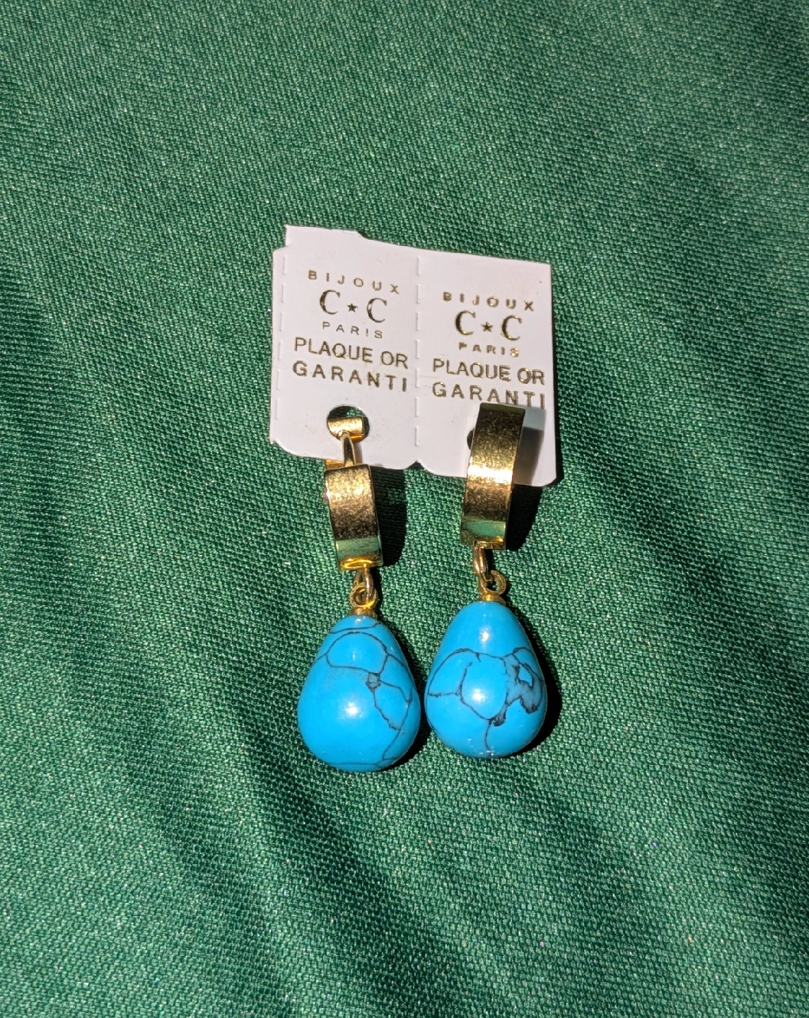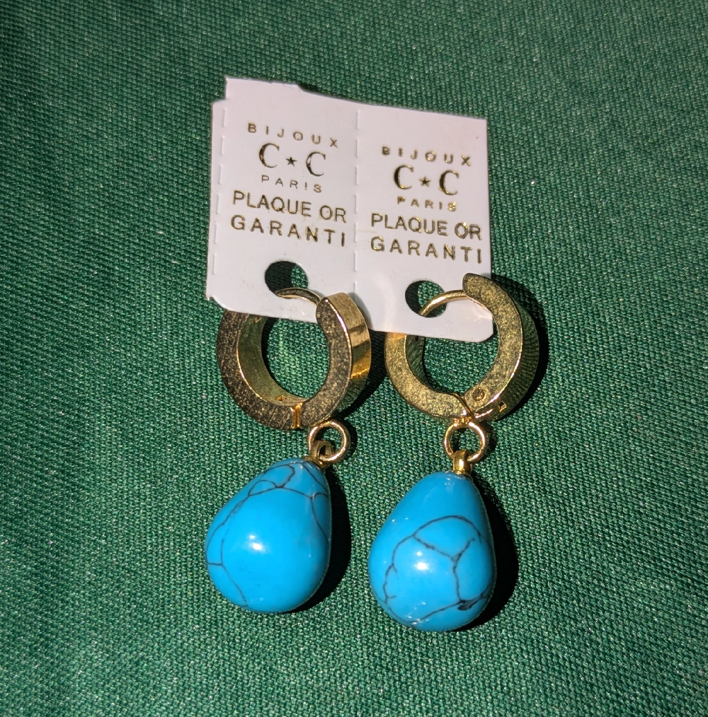 75These are a pair of Bijoux C*C Paris earrings. They feature a gold-tone hoop with a turquoise teardrop pendant. They are in great condition and ready to add a pop of colour to your outfit