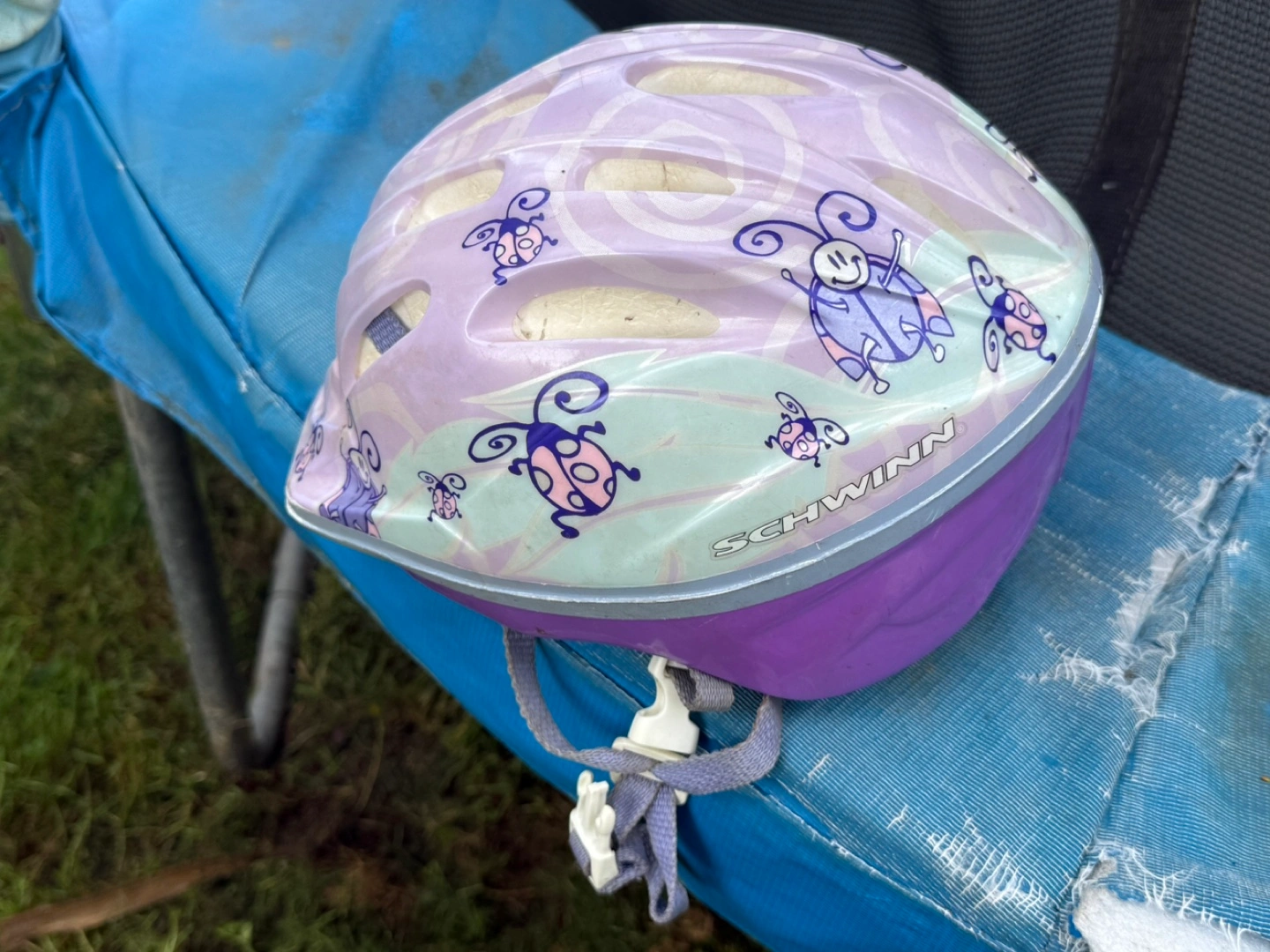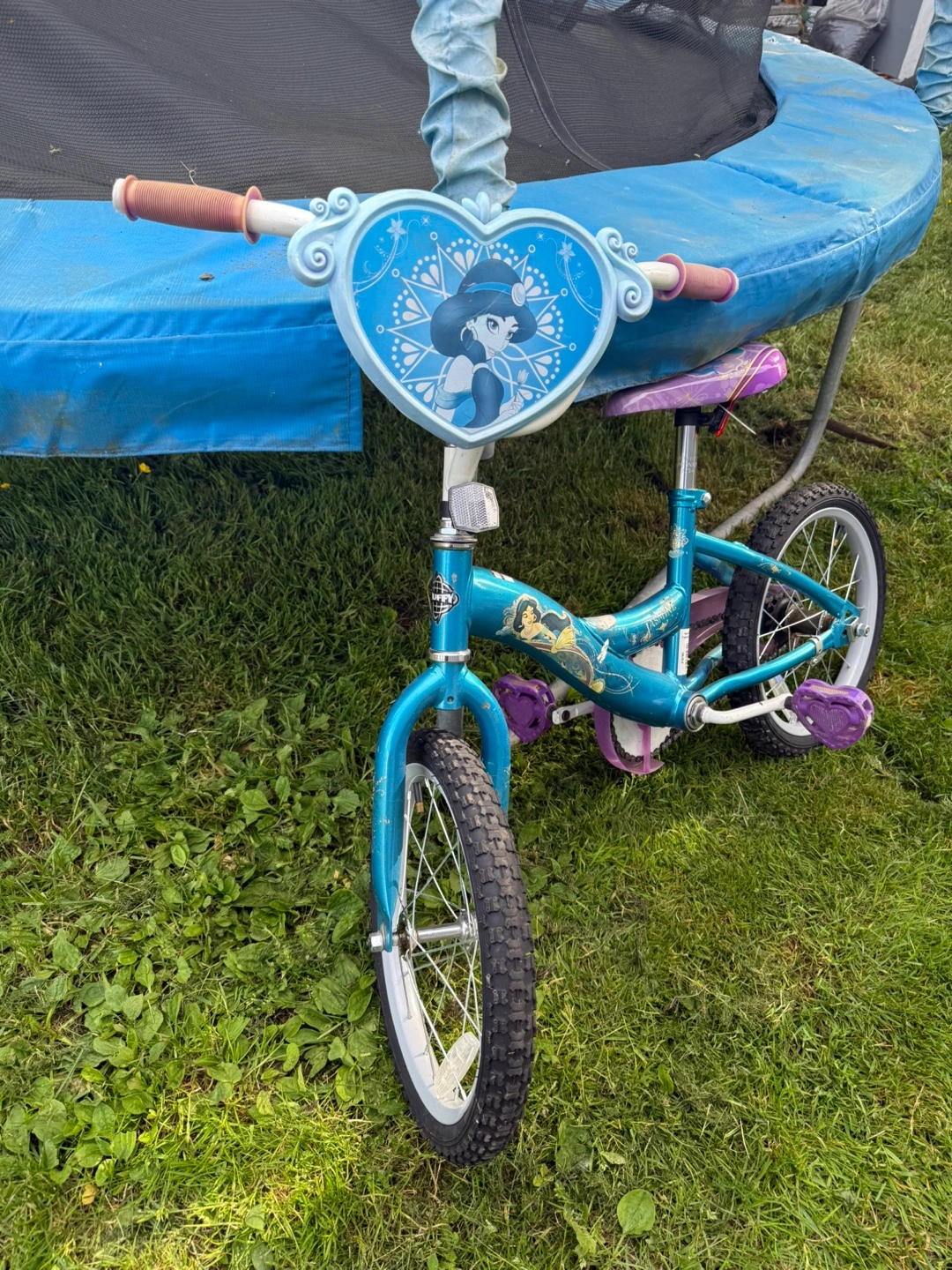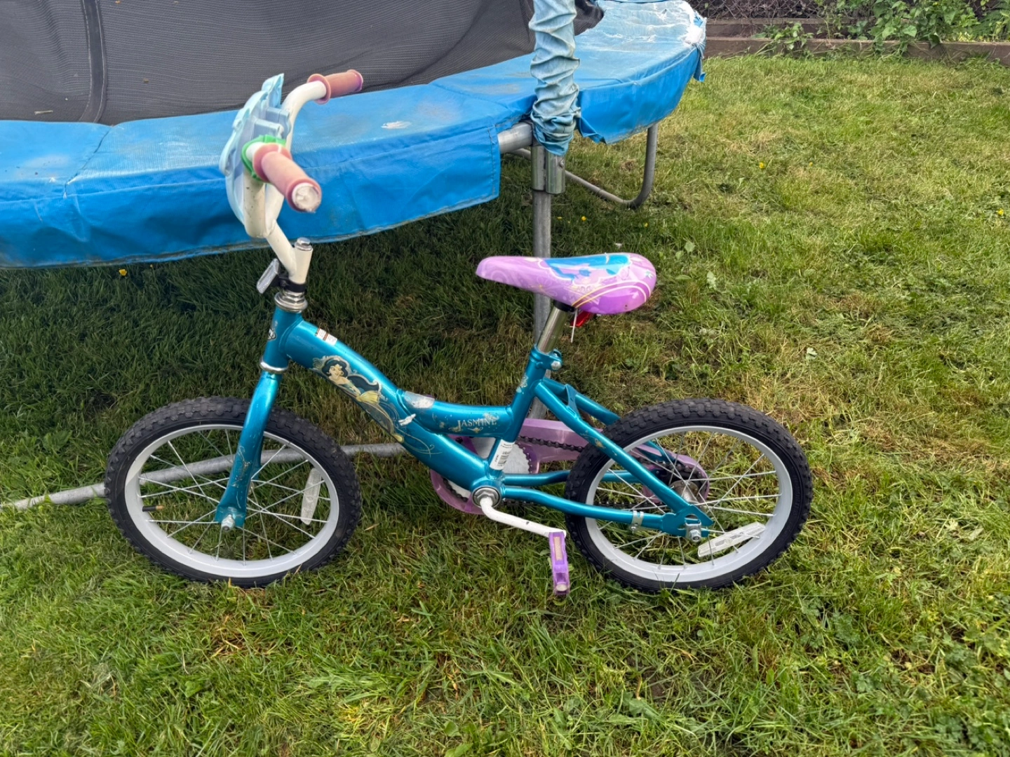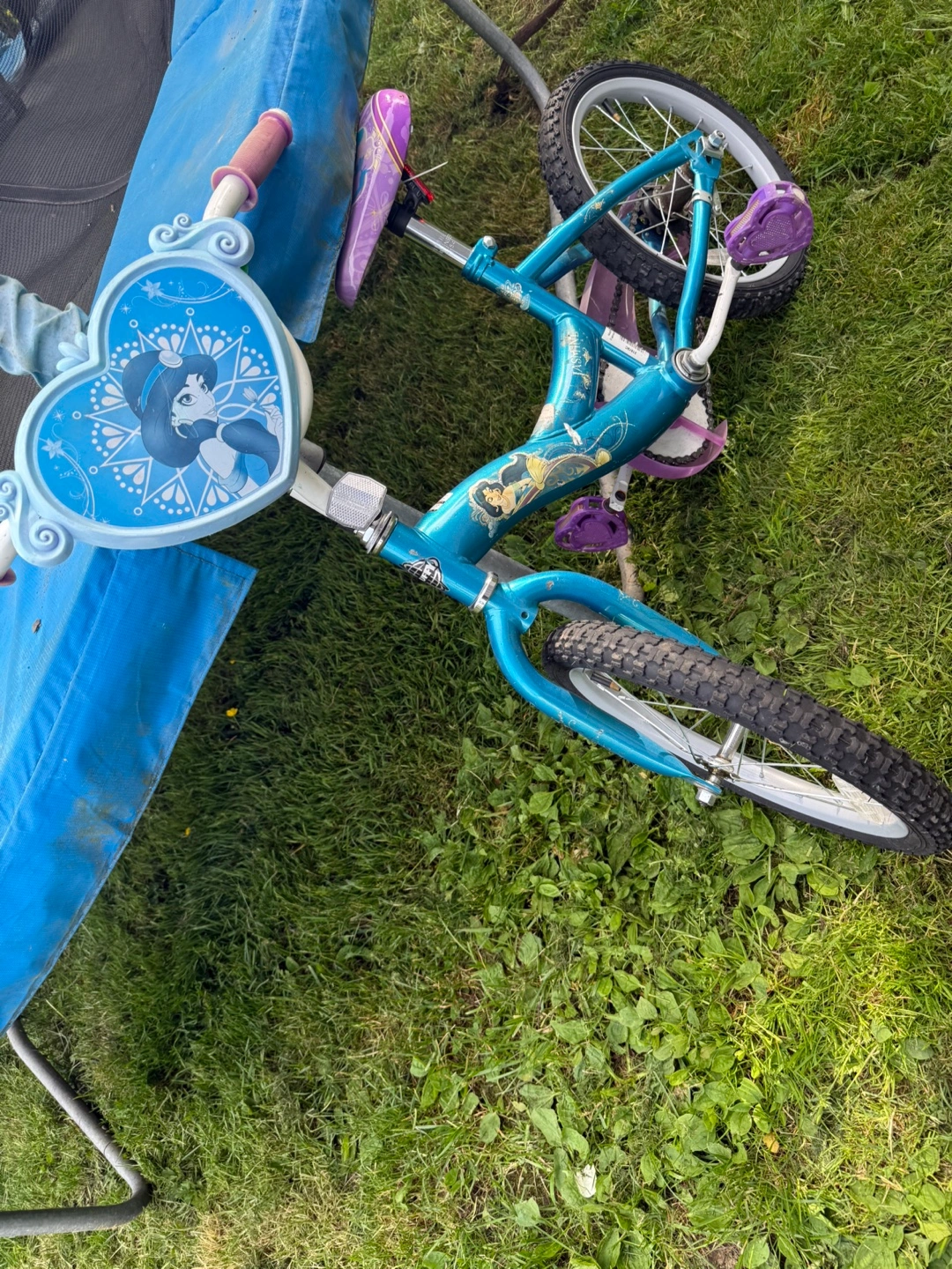 5Girls' Schwinn bike and helmet. Bike features Jasmine from Disney's Aladdin. Teal frame, purple accents. Helmet shows minor wear, colourful ladybug design. Both used, good condition. Helmet for free with the bike.