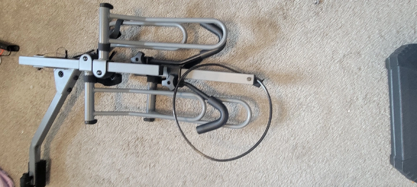 82Bike rack in good condition, ready to use Moveable rubberized hooks secure the bike to the rack while protecting its finish Center folds down for rear vehicle access and folds up when not in use Hooks and wheel trays adjust to fit almost all bike frames and sizes Includes locks to secure the bike to your rack and the rack to your vehicle Max Weight: 1 Bike 45LBS. 2 Bikes 90 LBS.