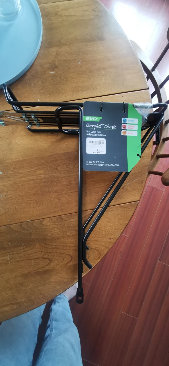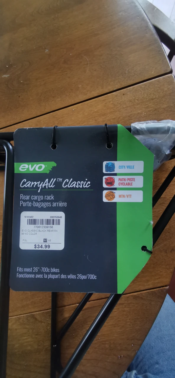 5Evo Carry-All bike rear rack. Never used with tags still attached. Fits most 700cc and 26" tires. I bought a new bike with disc brakes so this doesn't fit.