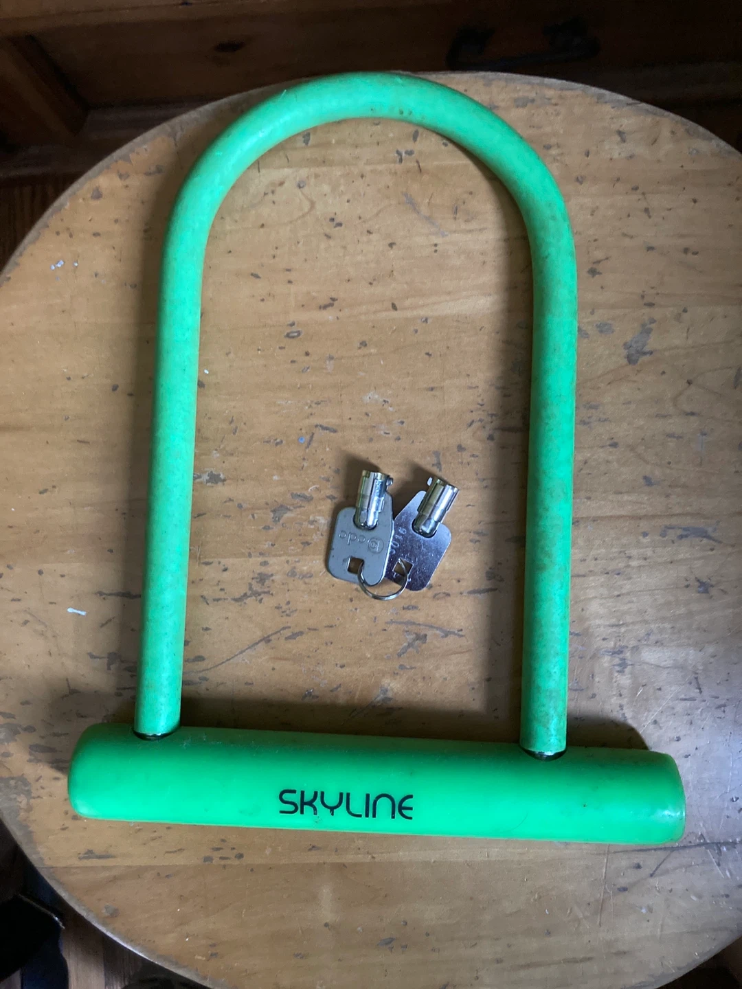 Selling a bike U-lock in a bright green colour. It comes with the keys shown in the picture to keep your bike safe and secure.