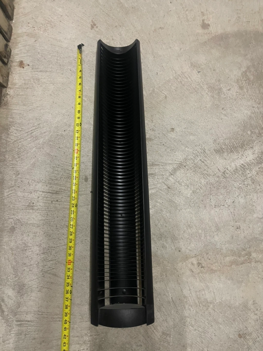 This black plastic CD storage tower holds many discs. It's designed to stand upright for easy access to your music collection. Approximately 17 inches tall.