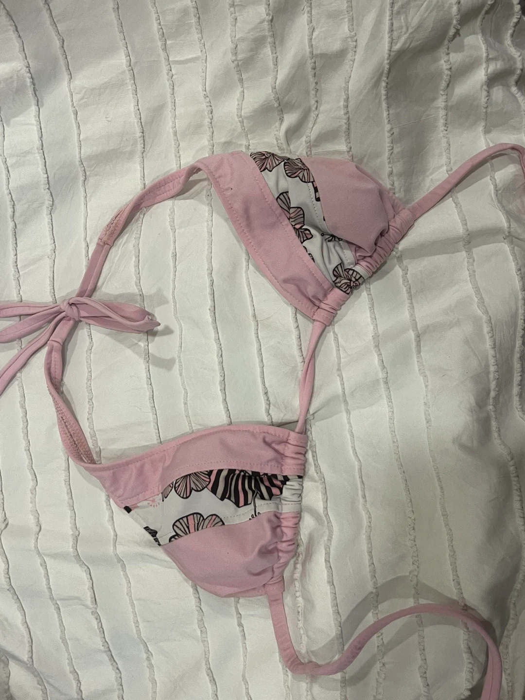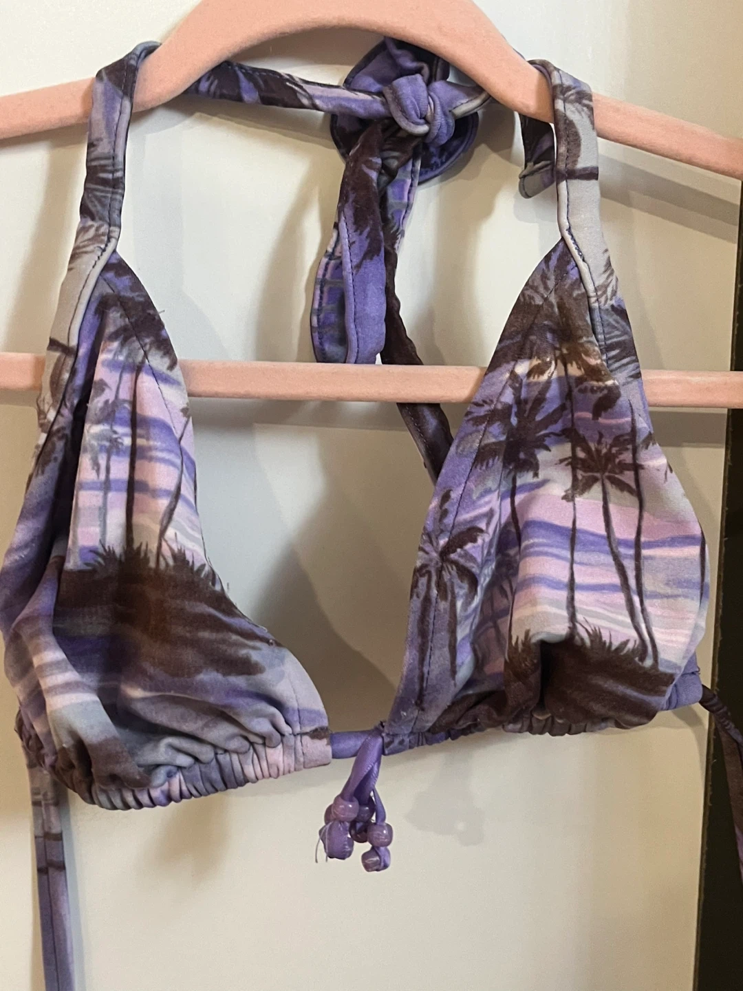 Selling a cute bikini top. It has a unique pattern with palm trees and a purple hue. It's in good condition and ready for summer Other top is a baby pink $5 each or $10 together