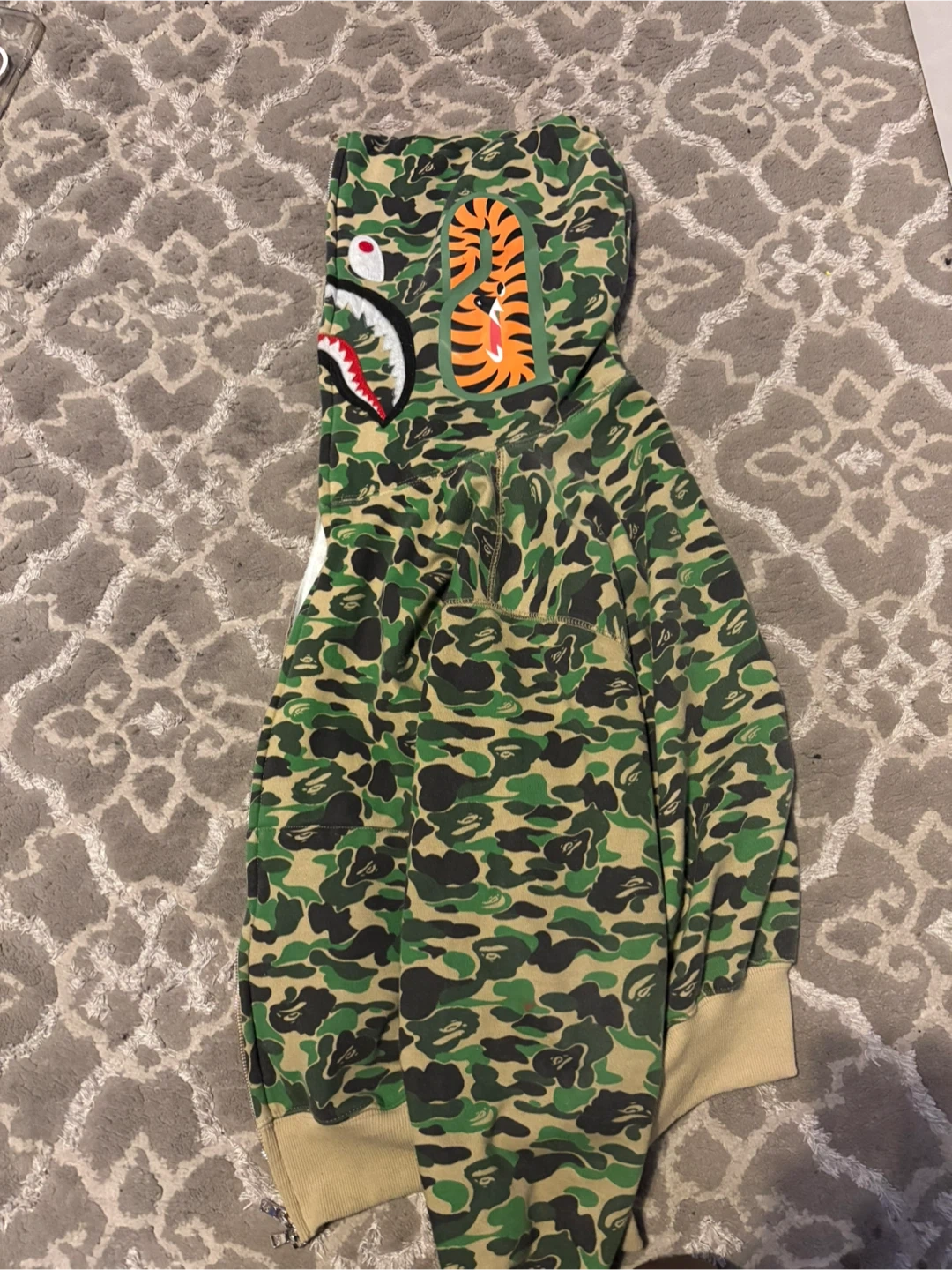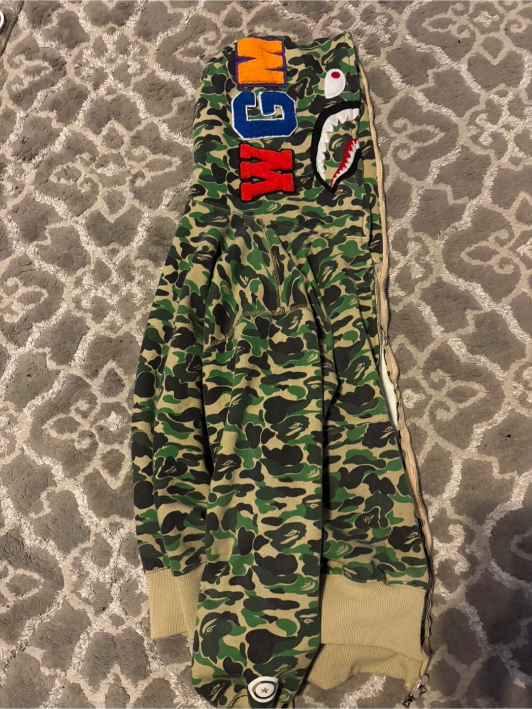 This BAPE full zip hoodie comes in a classic camo shark design. It features a full zip closure and a cozy hood. This piece is great for layering!