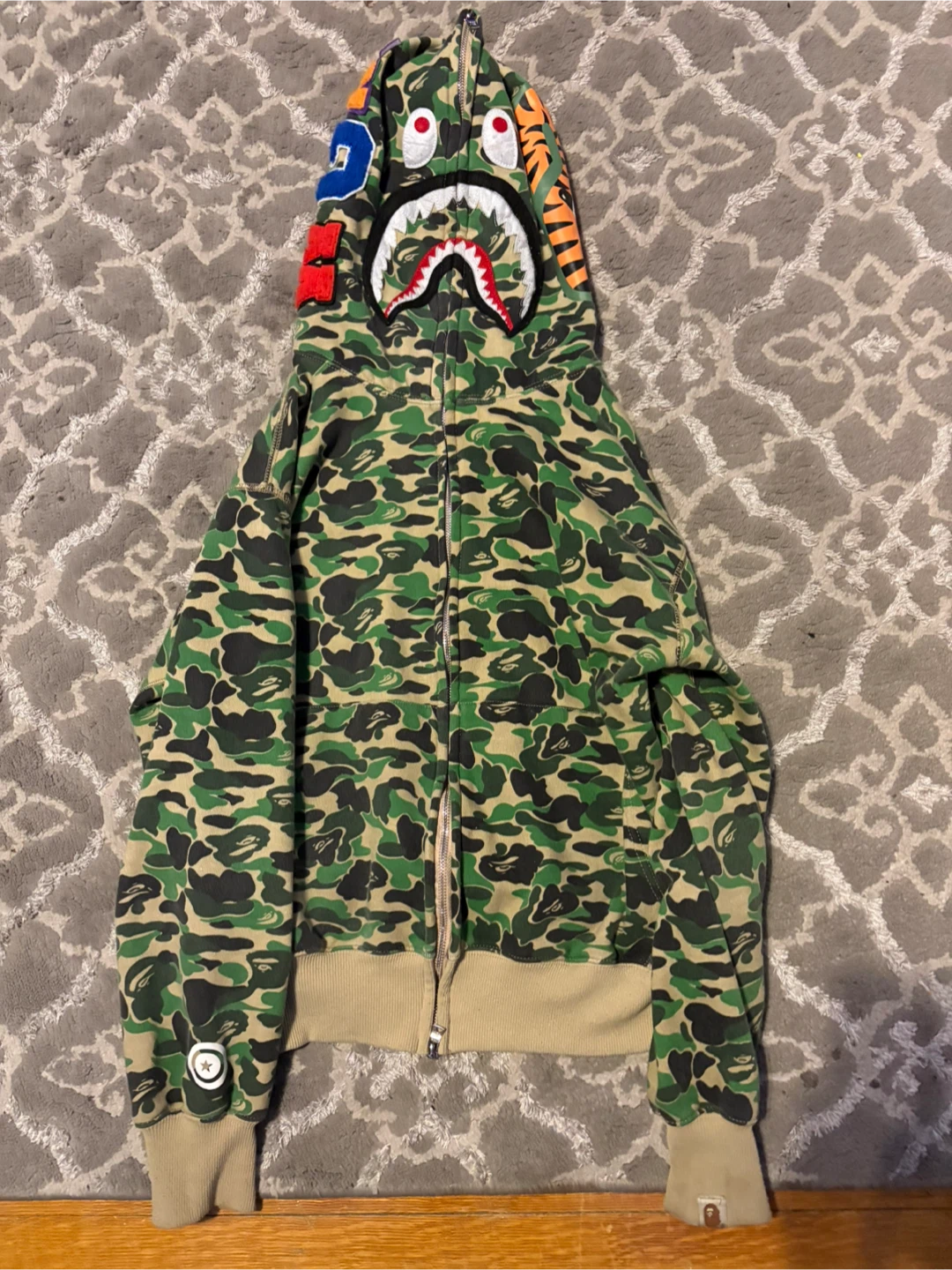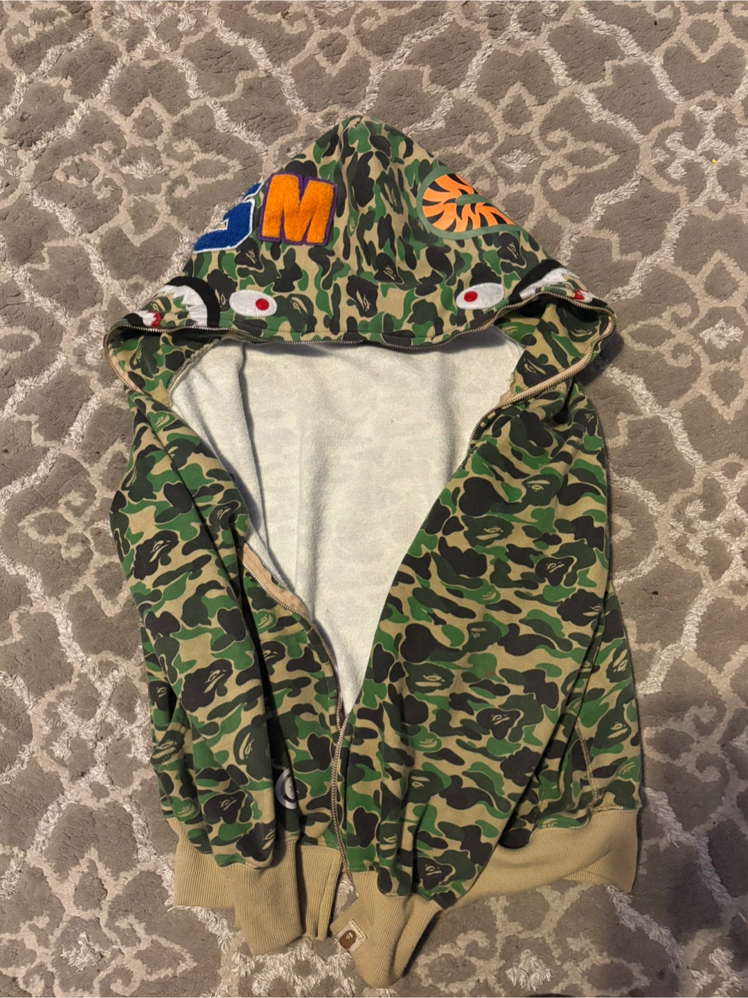 This BAPE full zip hoodie comes in a classic camo shark design. It features a full zip closure and a cozy hood. This piece is great for layering!