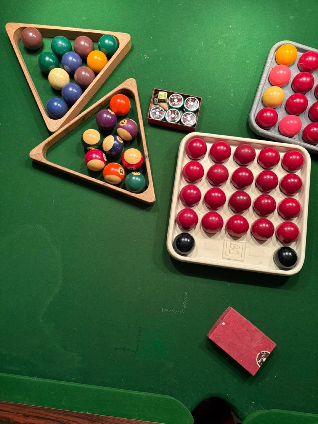26Selling a billiard/pool ball set, complete with triangles and a tray! Perfect for your game room or rec space. The set appears to be in good condition and ready for play