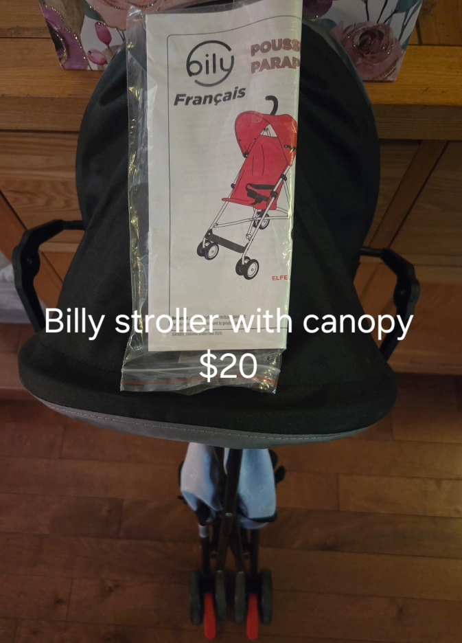10The stroller is black, with a folded base. It has a canopy, and it looks like it folds for easy storage, which is lovely. The original manual is included.