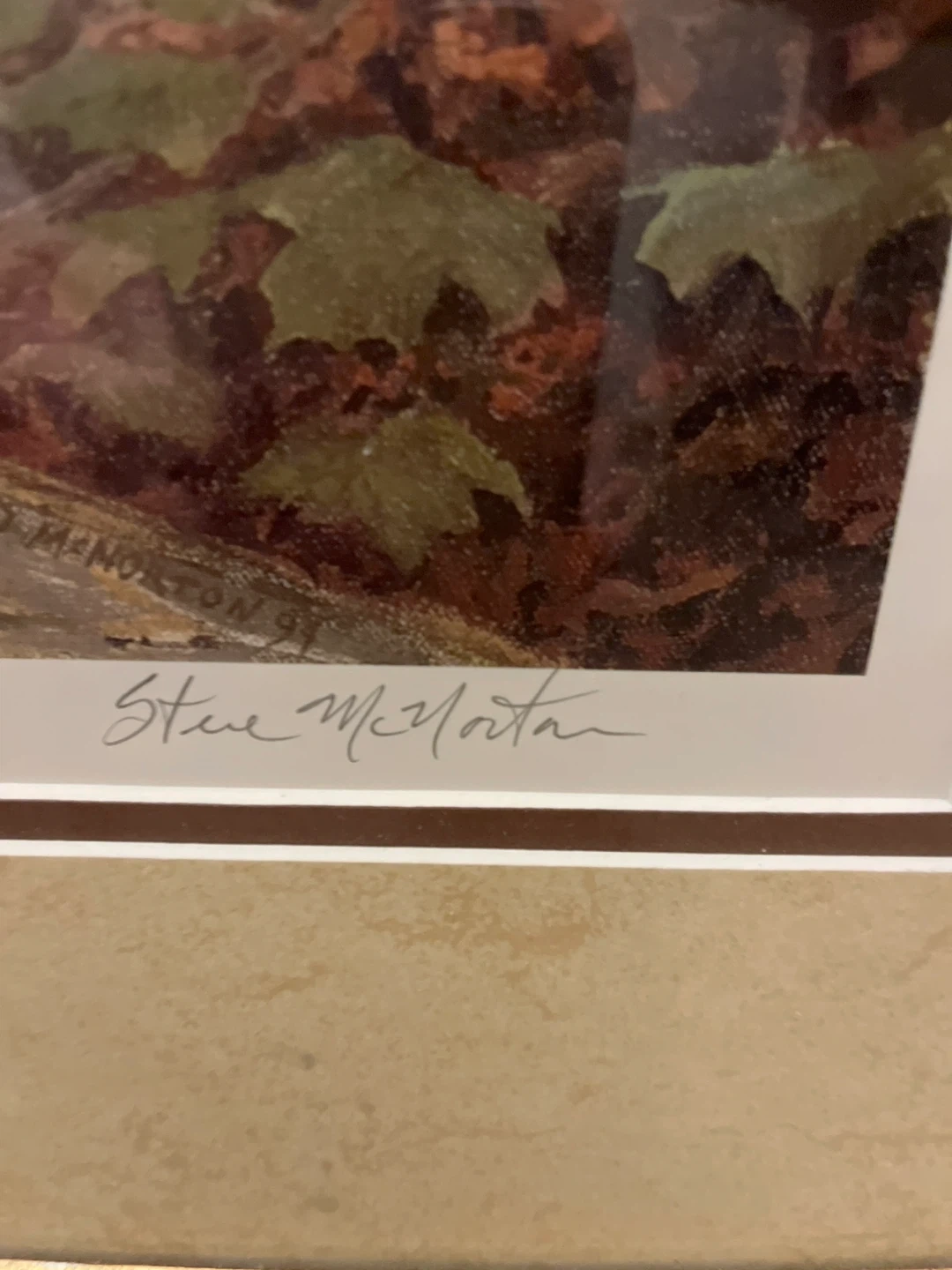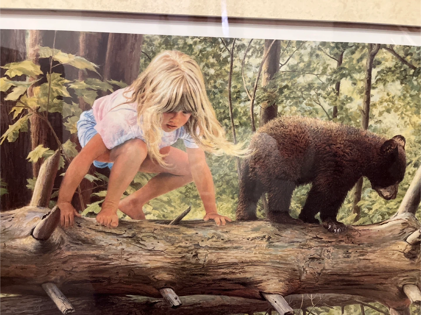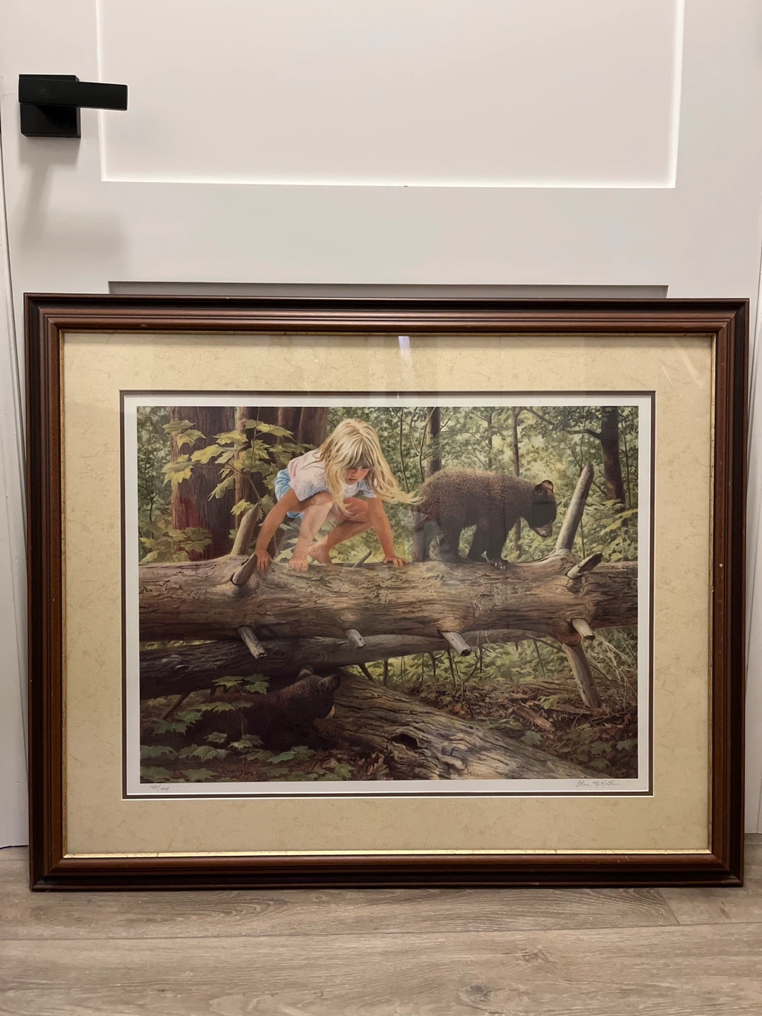 This framed print depicts a young girl and a bear cub on a fallen log in a forest setting. It's signed by the artist, Steve Marton. The artwork measures 26x38 inches framed.