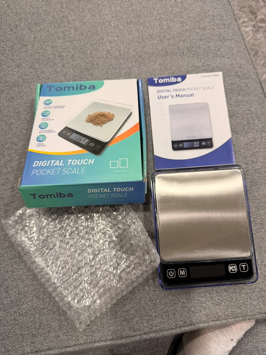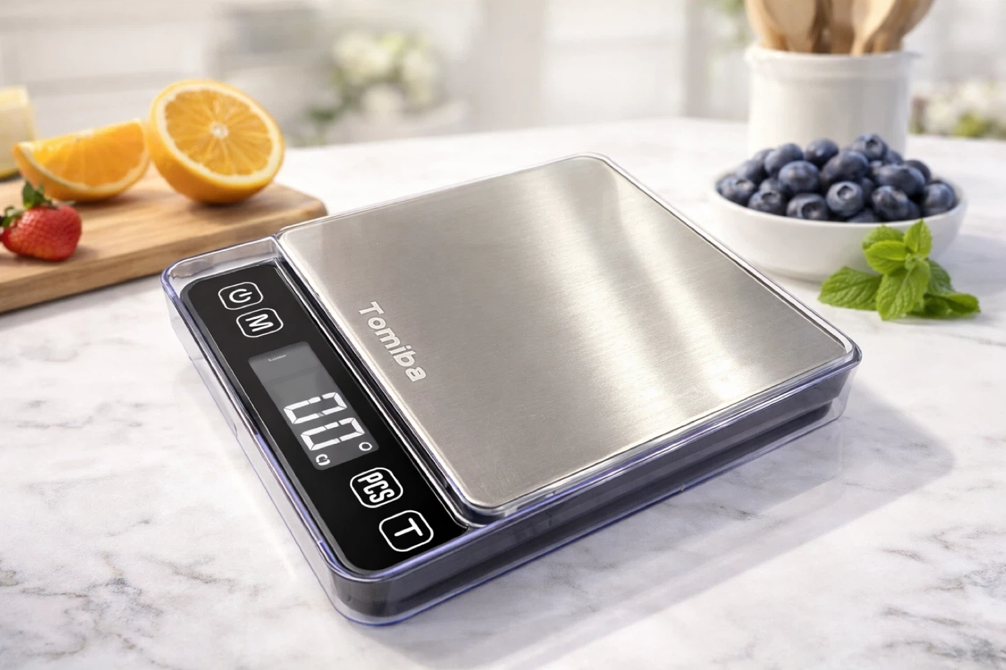 Compact and precise Tomiba Digital Touch Pocket Scale, perfect for cooking, baking, meal prep, coffee, or fitness tracking.