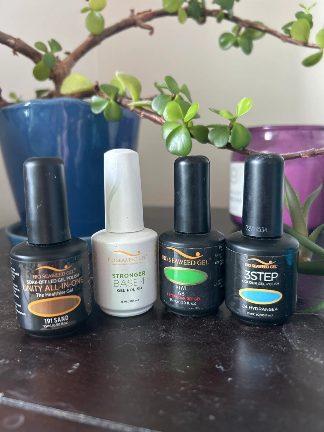 226Selling a set of four Bio Seaweed Gel nail polishes. Includes: - Unity All-In-One Gel Polish in 191 Sand - Stronger Base-1 Gel Polish - 3 Step Colour Gel Polish in Kiwi GB - 3 Step Colour Gel Polish in 84 Hydrangea Not heavily used, base more used than colors. Beginners friendly, texture is not too thick but not watery either. Never triggered any allergies or burns on my nails