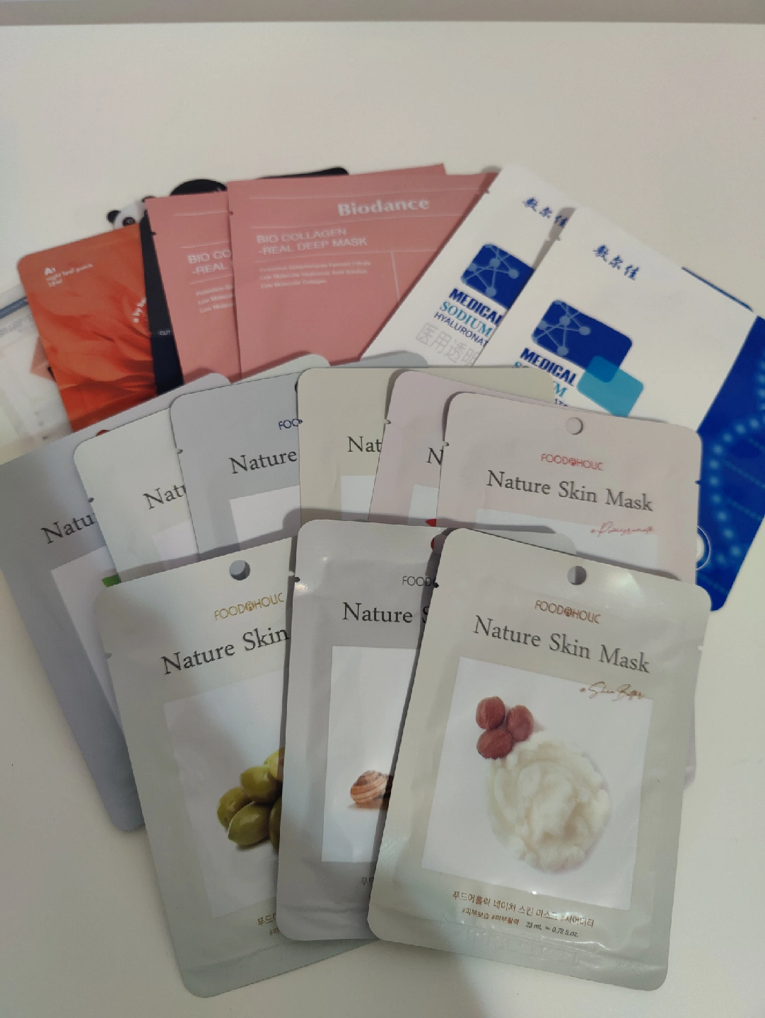 A collection of face masks for different skin needs! Includes Biodance Bio Collagen Real Deep Mask and Foodaholic Nature Skin Masks. Perfect for a relaxing skincare routine
