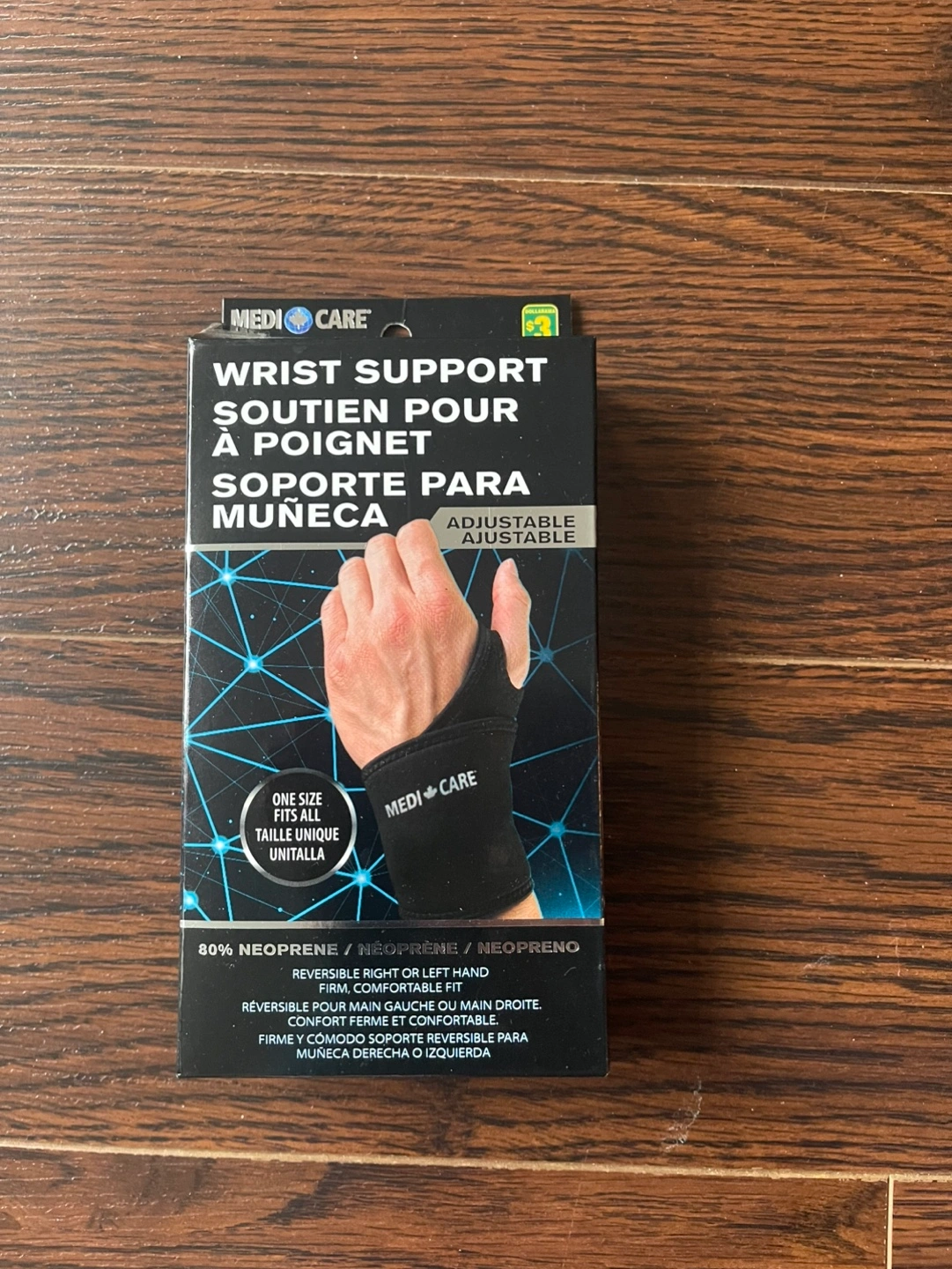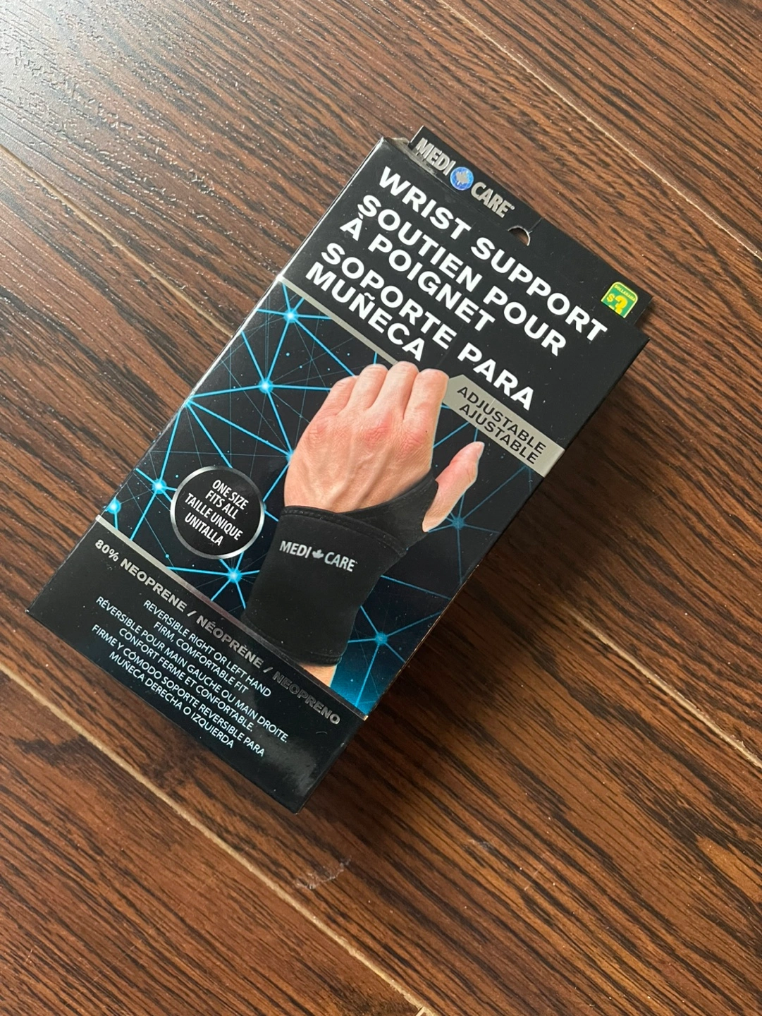 New wrist support. Adjustable and reversible for right or left hand. 80% neoprene. One size fits all.