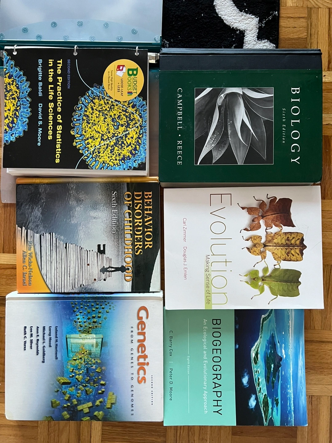 Selling a set of textbooks including Biology, Genetics, Evolution, and Biogeography. Perfect for students or anyone interested in these subjects! They're in good condition and ready for a new home. $10-$25 each