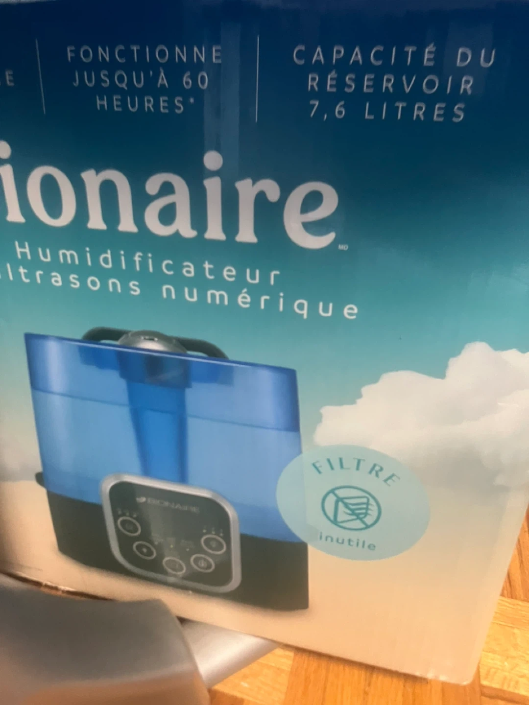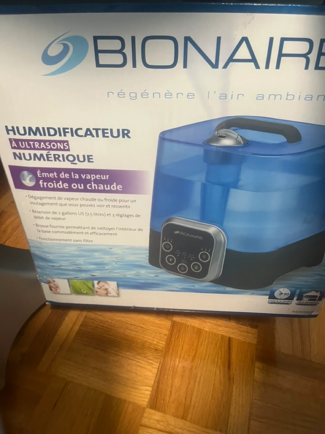 Selling 2 Bionaire ultrasonic humidifiers. It features a digital display and can emit cool or warm mist. The reservoir holds 2 gallons (7.5 litres) and has 3 mist settings. It also has a feature that helps clean the inside of the base, and operates without filters