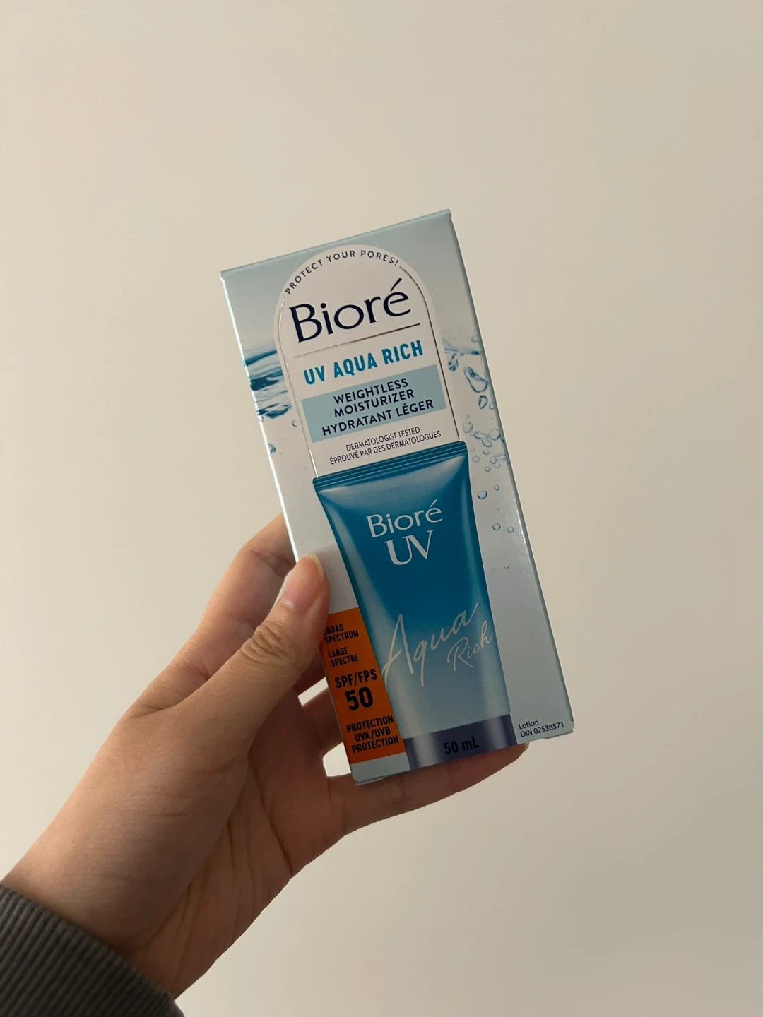 Selling a Bioré UV Aqua Rich Weightless Moisturizer with SPF 50. This is a broad spectrum sunscreen that protects your skin. It comes in a 50 ml container. The expiration date is November 2026