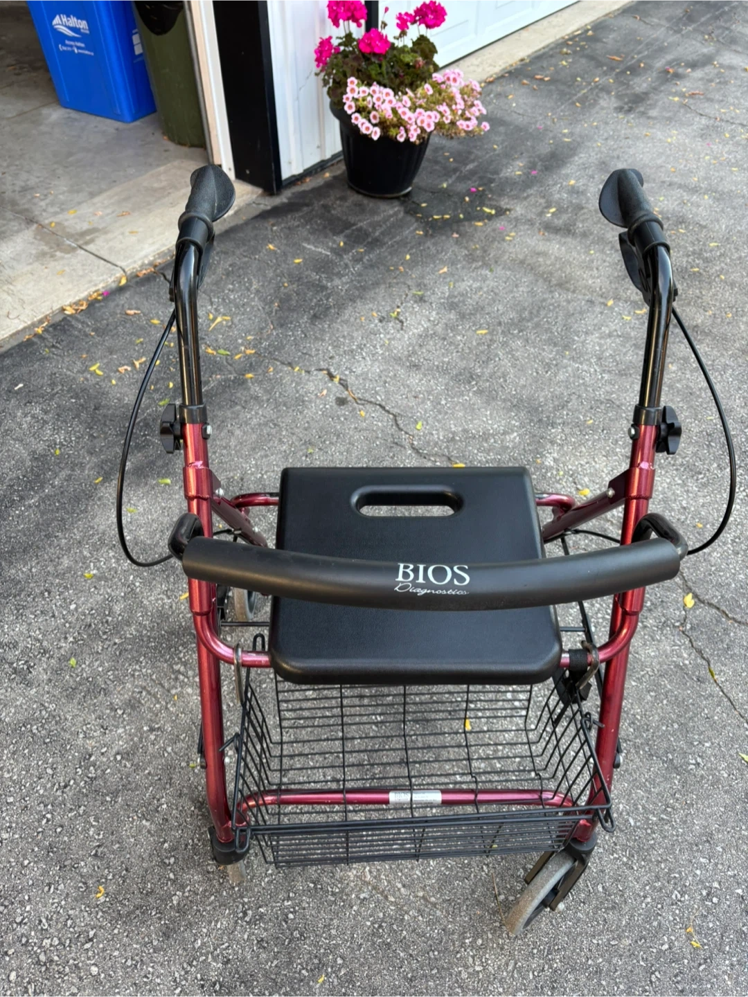 BIOS Diagnostics walker with a seat and basket. Great for getting around with a little extra support. The seat is handy for taking breaks, and the basket is perfect for carrying groceries or other items. It's in good condition and ready for a new home