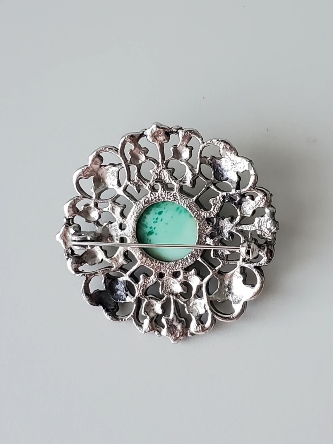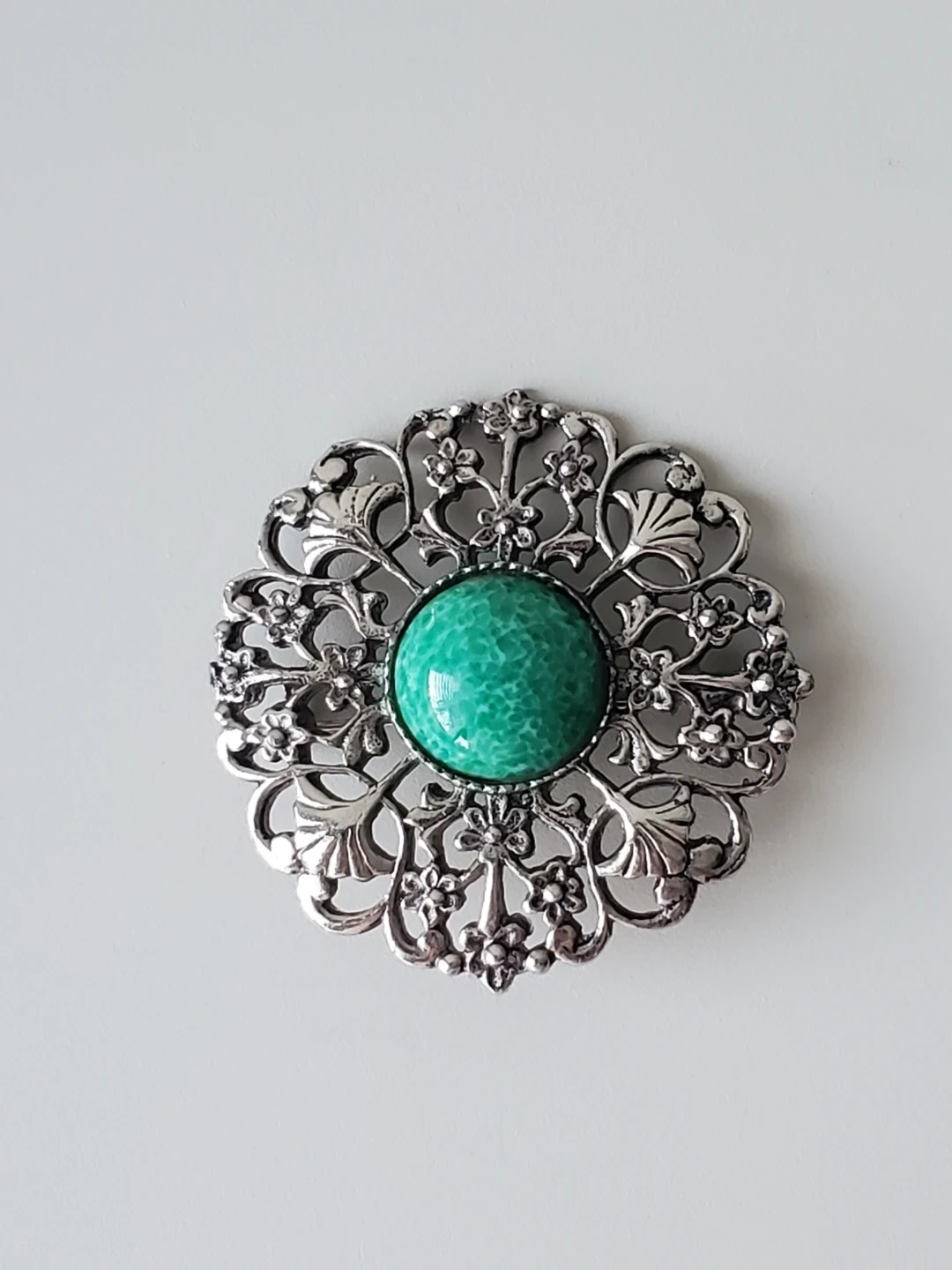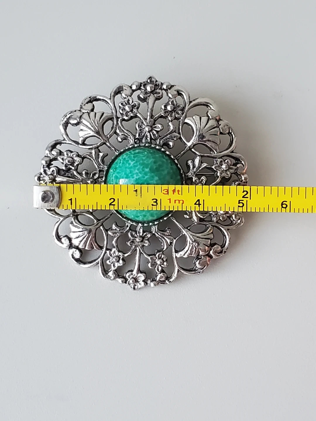 This vintage brooch features a metal filigree design. Unsure of the round green stone in the centre. The brooch measures approximately 2 inches in diameter. Pickup in Mission area.