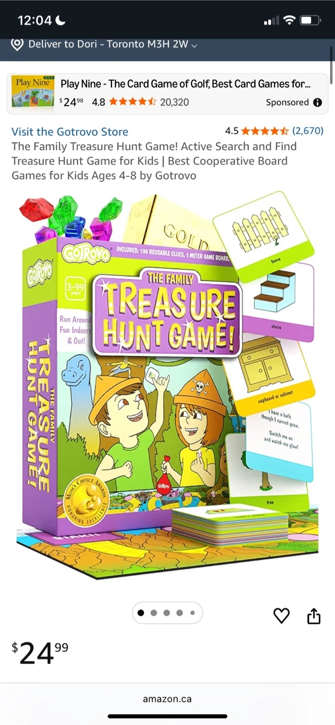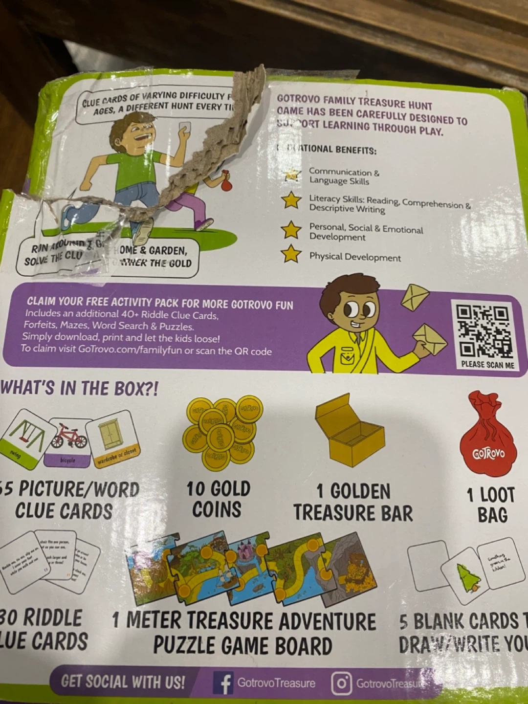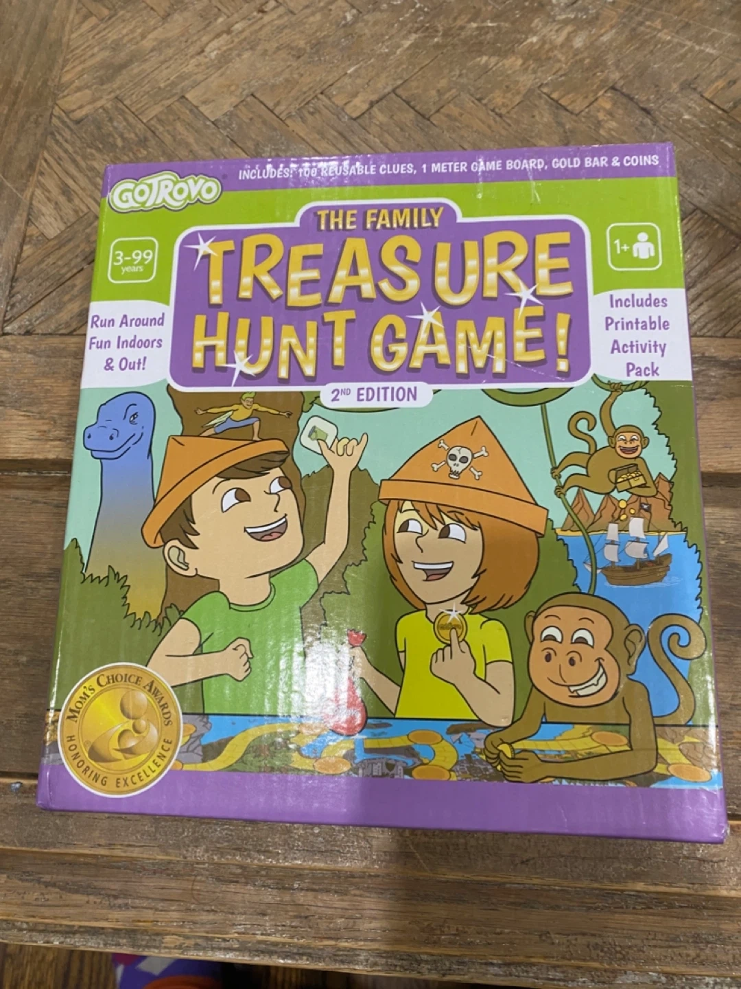 This is the 2nd edition of The Family Treasure Hunt Game by Gotrovo. It includes 65 picture/word clue cards, 30 riddle clue cards, 10 gold coins, 1 golden treasure bar, 1 loot bag, 5 blank cards to draw/write your own clues, and a 1 meter treasure adventure puzzle game board. The game is recommended for ages 4-8 and can be played indoors or outdoors. It’s in brand new condition with all parts included. The box is open and damaged- please refer to all the pictures for more details.