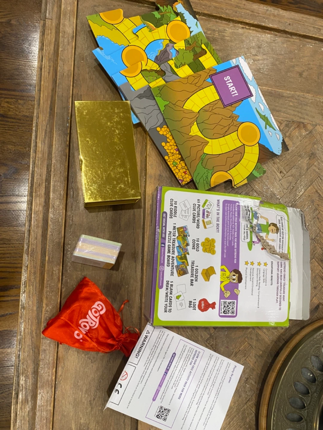 This is the 2nd edition of The Family Treasure Hunt Game by Gotrovo. It includes 65 picture/word clue cards, 30 riddle clue cards, 10 gold coins, 1 golden treasure bar, 1 loot bag, 5 blank cards to draw/write your own clues, and a 1 meter treasure adventure puzzle game board. The game is recommended for ages 4-8 and can be played indoors or outdoors. It’s in brand new condition with all parts included. The box is open and damaged- please refer to all the pictures for more details.