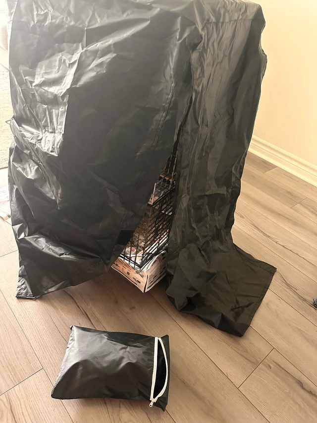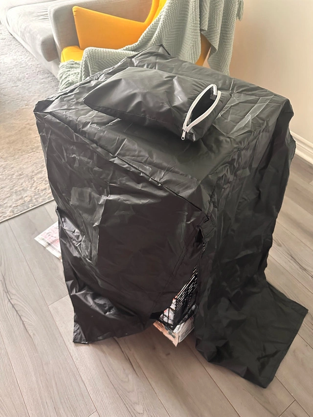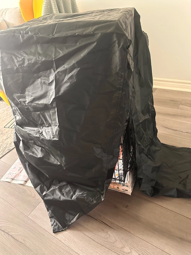 10New Bird cage cover for blocking light and ventilation, nighttime or day time pet cage cover, suitable for pets cats, ferrets, parrots and other small animals. Dense and blackout cover. Material plastic kind. Comes with cover Size small. Dimensions: 19/19/40 inches (L/W/H) Reason to sell:- Not even used once as my birds are not comfortable with complete black out.