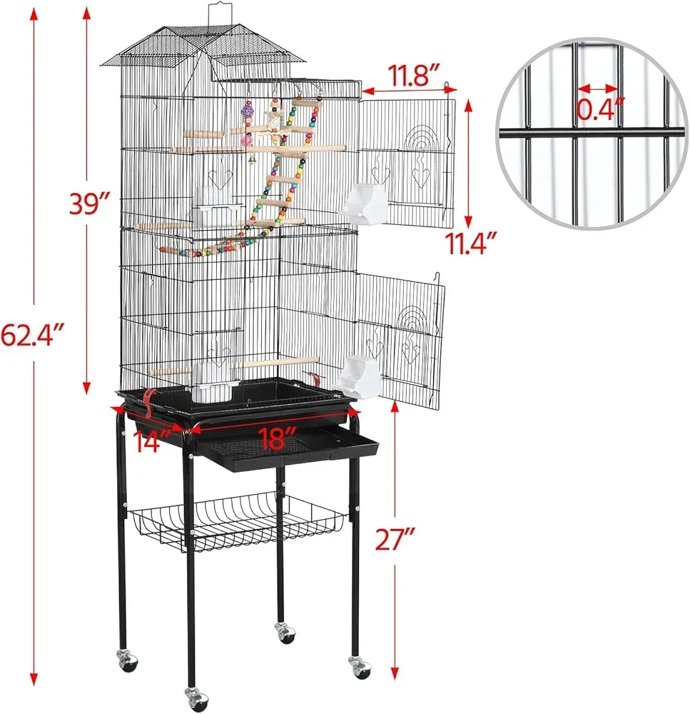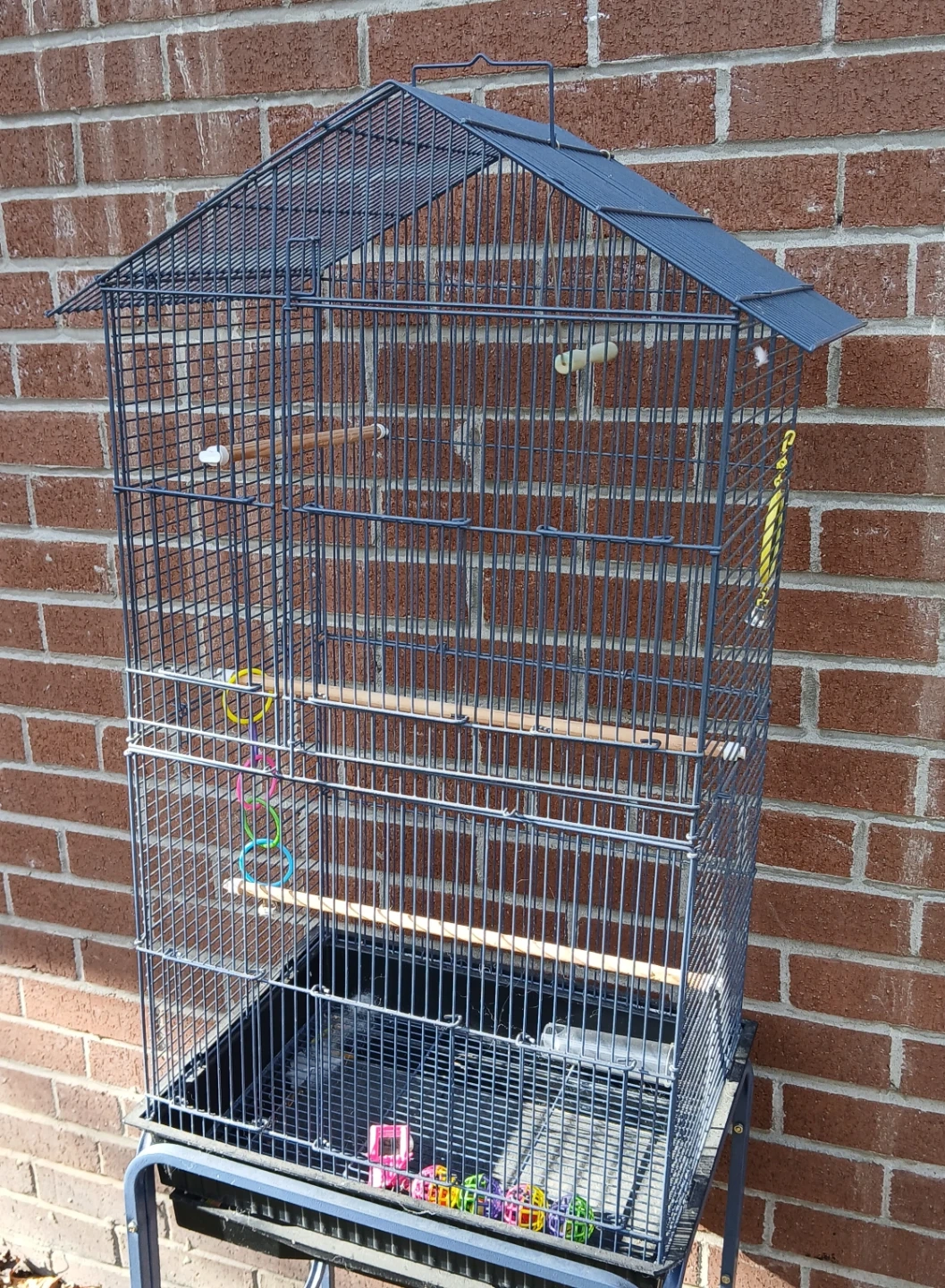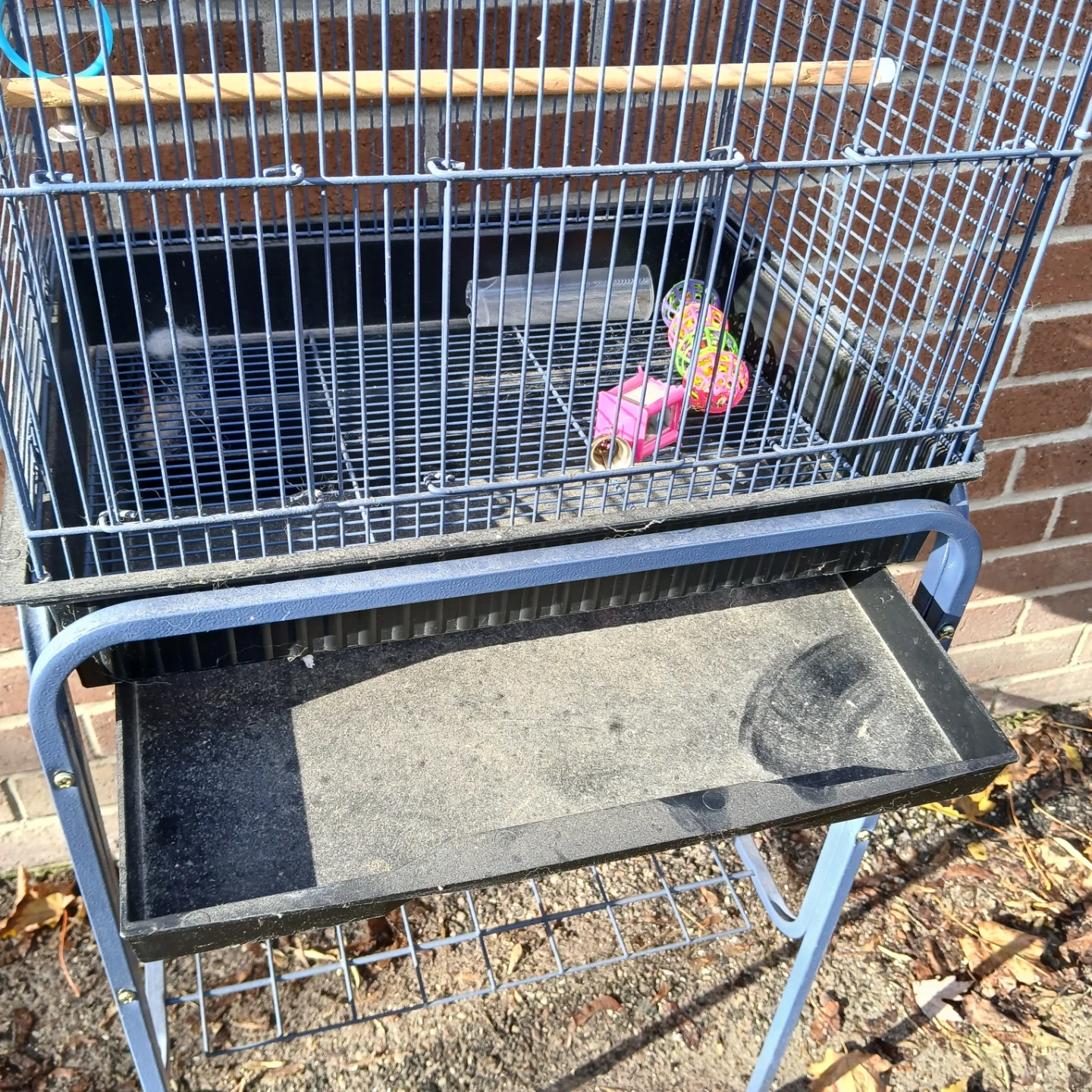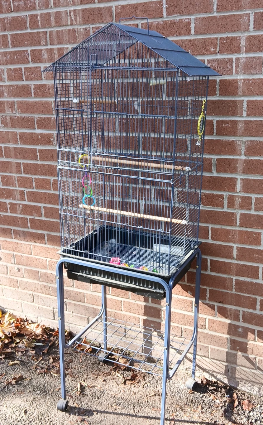 45Bird cage with stand. The cage is 39" tall, 18" wide, and 11.8" deep. The bar spacing is 0.4".
