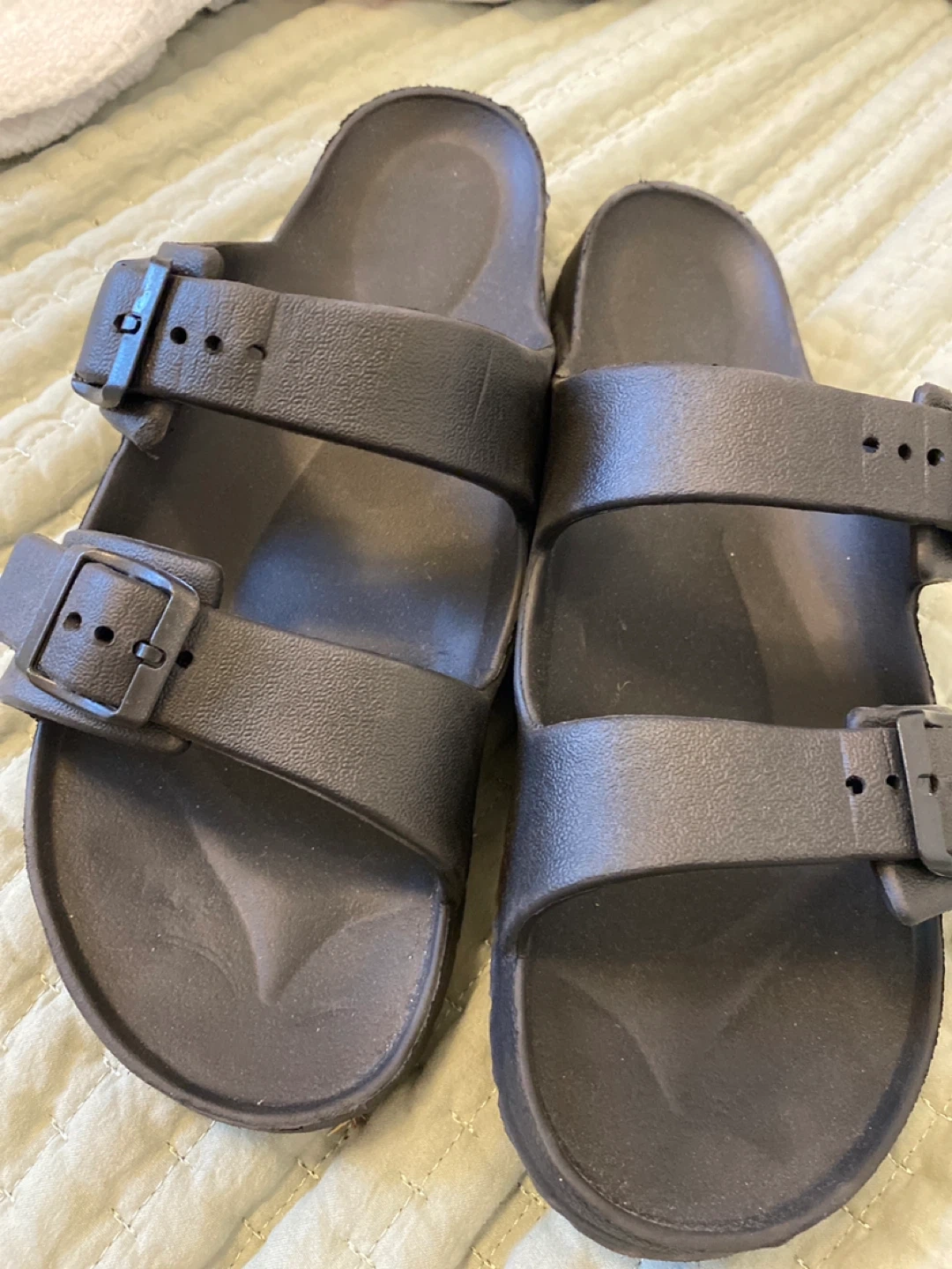 10Selling a pair of knockoff Birkenstock Arizona Essentials EVA sandals in black. These are super lightweight and perfect for summer. They're in great condition and ready for a new home! Size is not specified, please refer to the pictures.