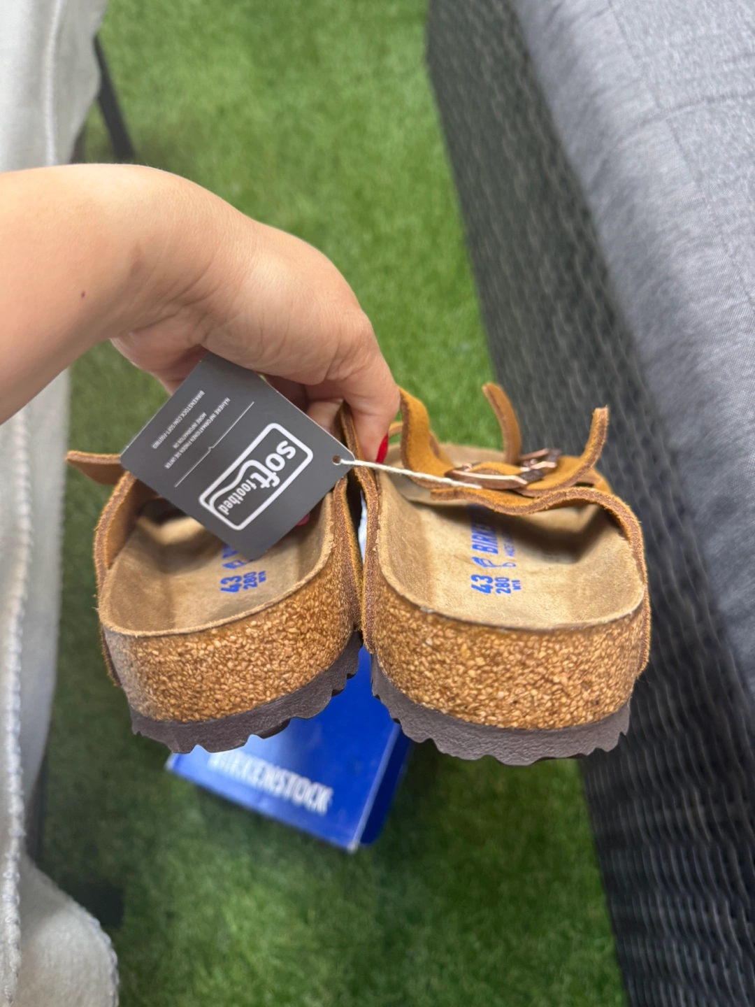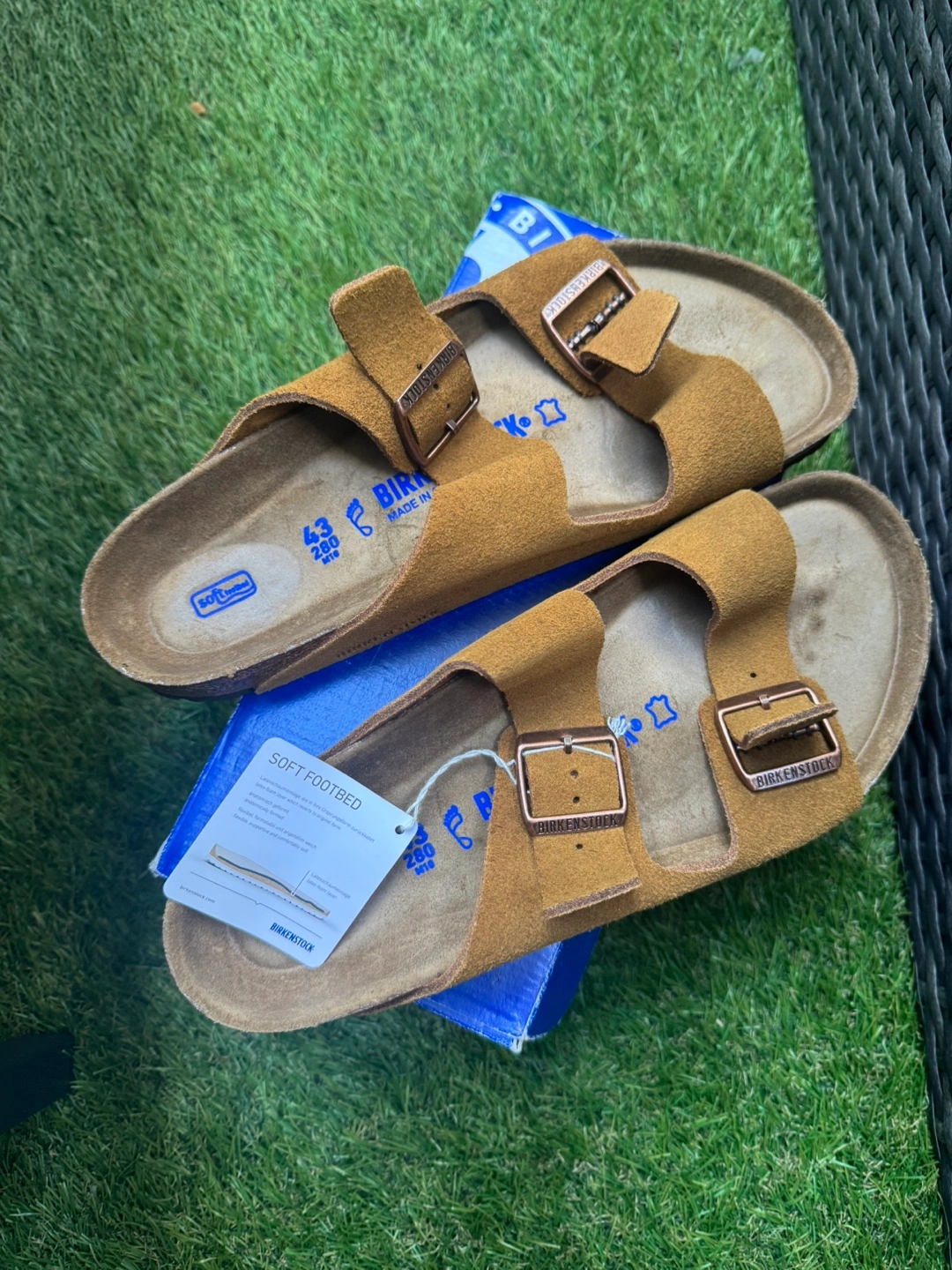 Brand New with box Selling a pair of Birkenstock Arizona sandals with the soft footbed. They are a size 43, which is a US Men's 10 or US Women's 12. The colour is a lovely tan or light brown. Comes with the original box! retails 180, husbnd paid 200 pick up Fraser Heights Surrey