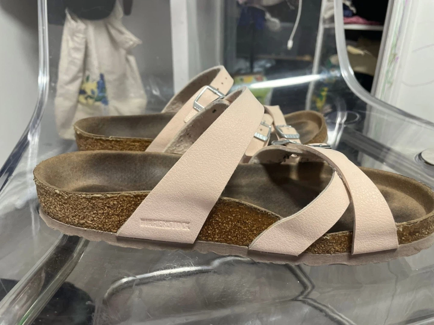 Selling a pair of Birkenstock sandals. They feature a light pink strap design and the classic Birkenstock cork sole. Perfect for everyday wear!