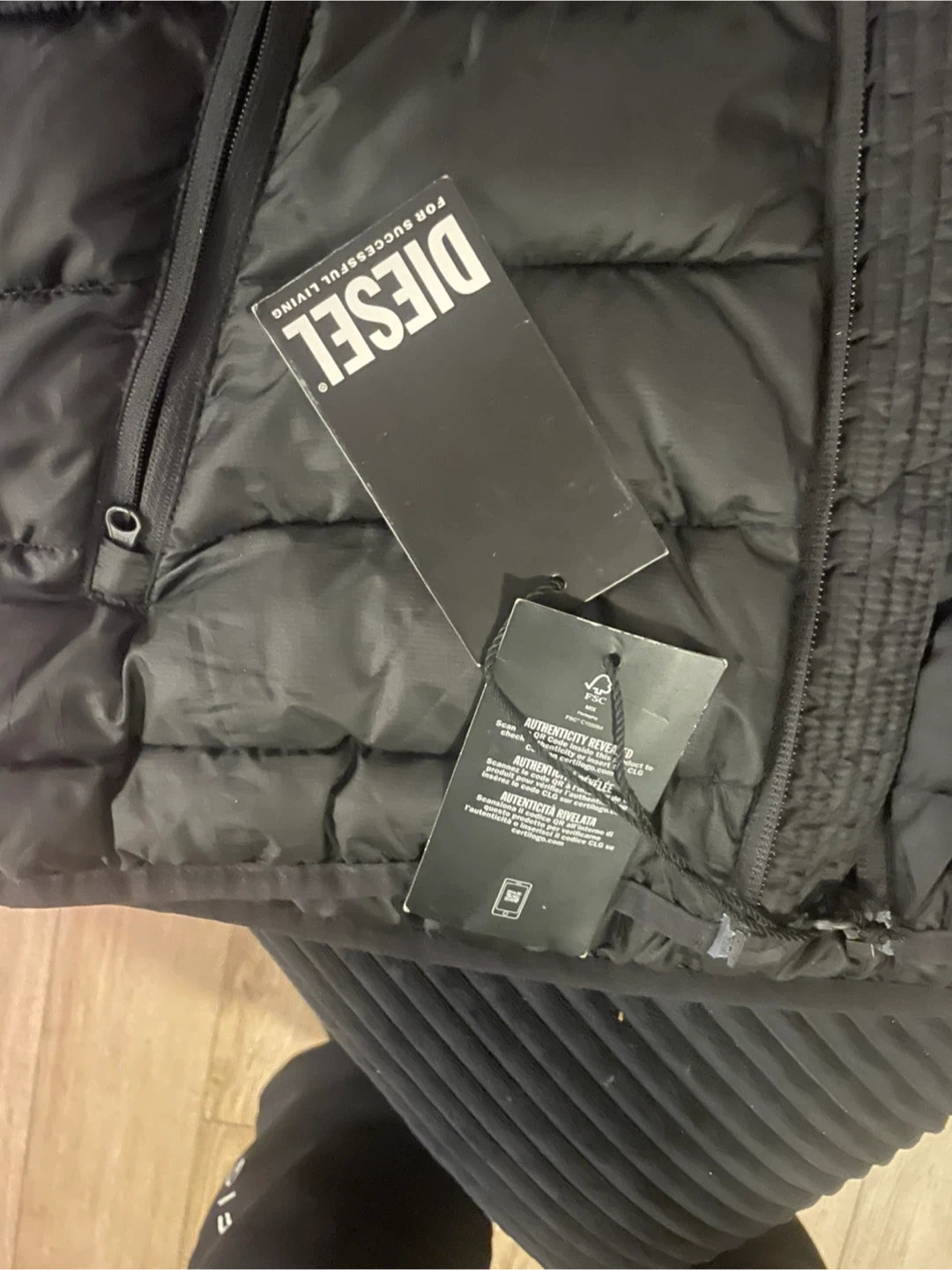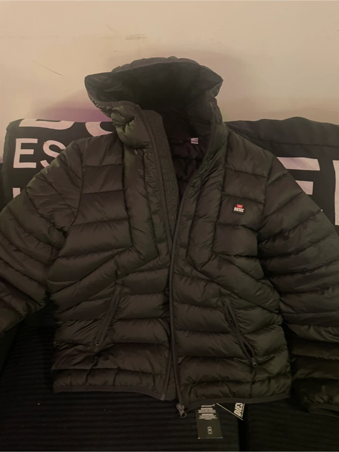 Diesel puffer jacket in black. Size is small. But fits quite large brand new Comes with original tags.