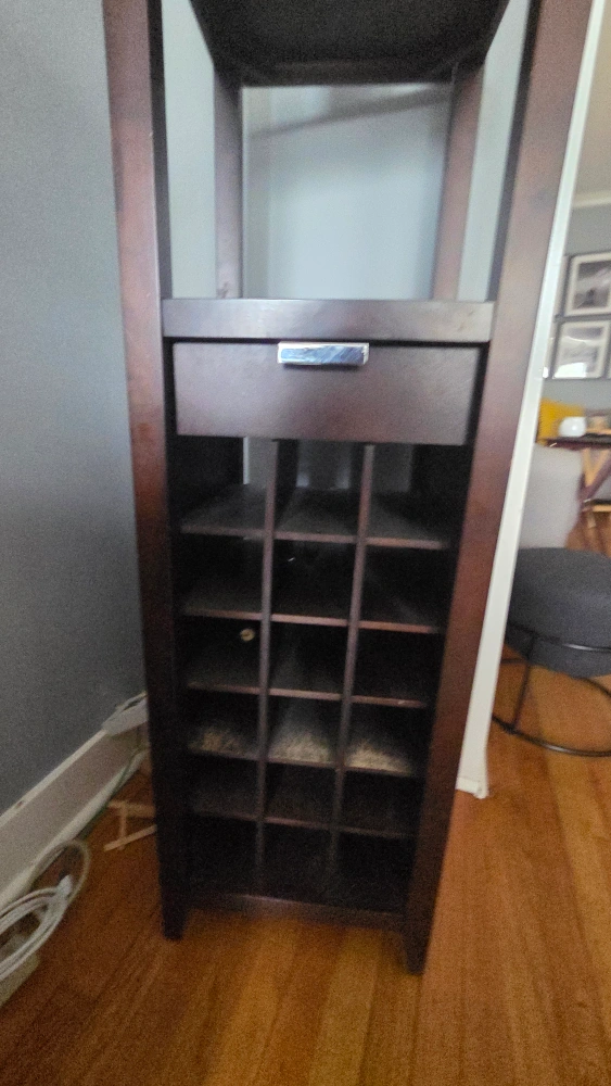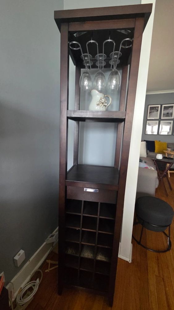 Tall, dark wood wine rack. Multiple shelves, wine bottle storage, small drawer, and hanging glass storage. Perfect for a bar cart or kitchen.