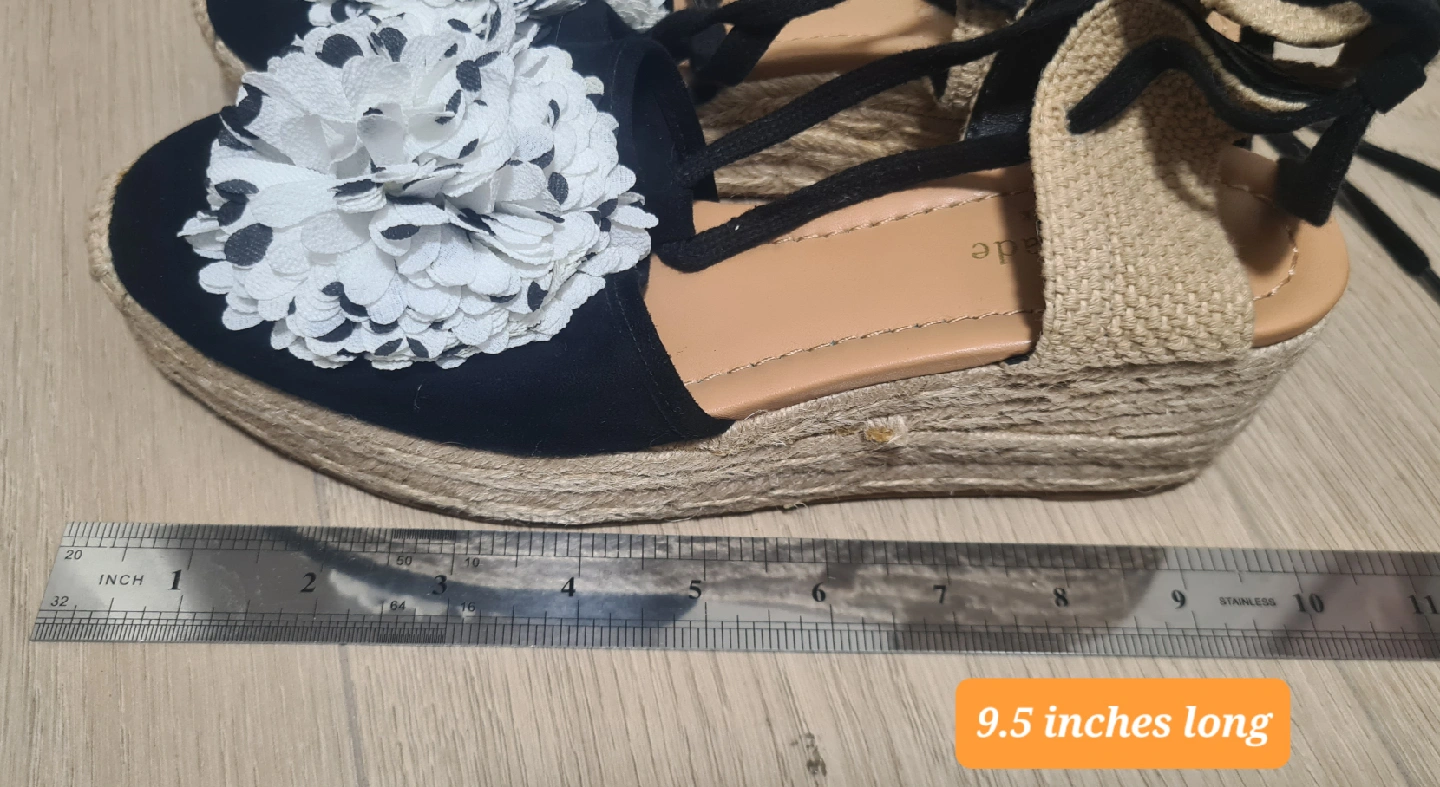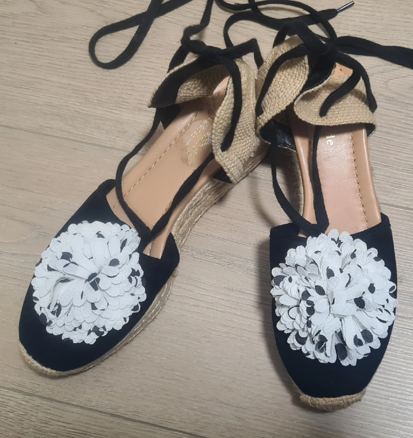 They feature a black upper with a white floral embellishment and a jute wedge heel.