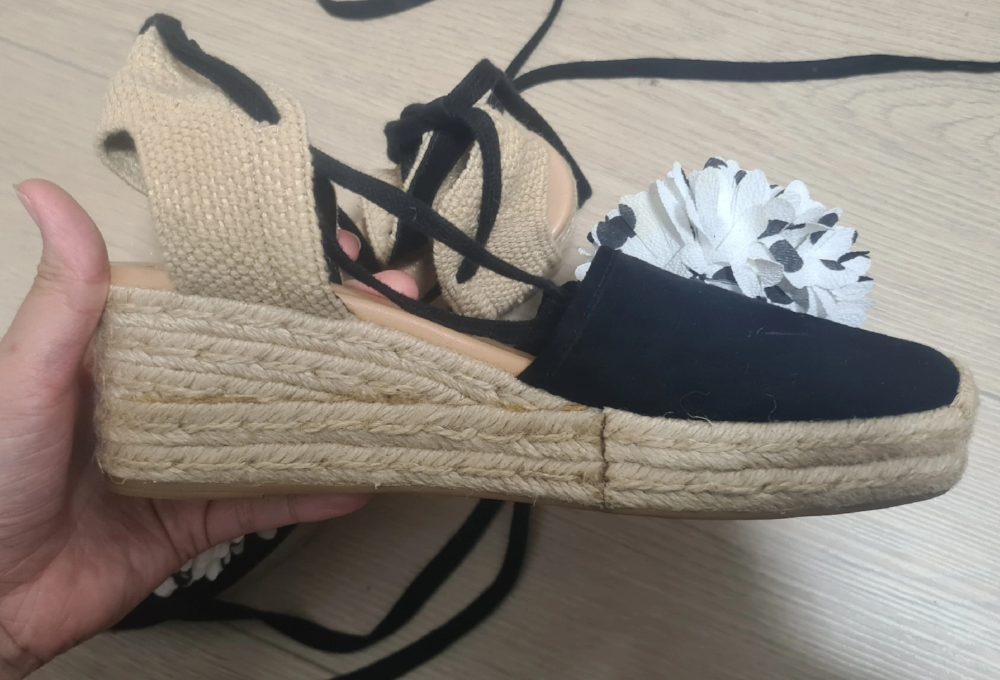 They feature a black upper with a white floral embellishment and a jute wedge heel.