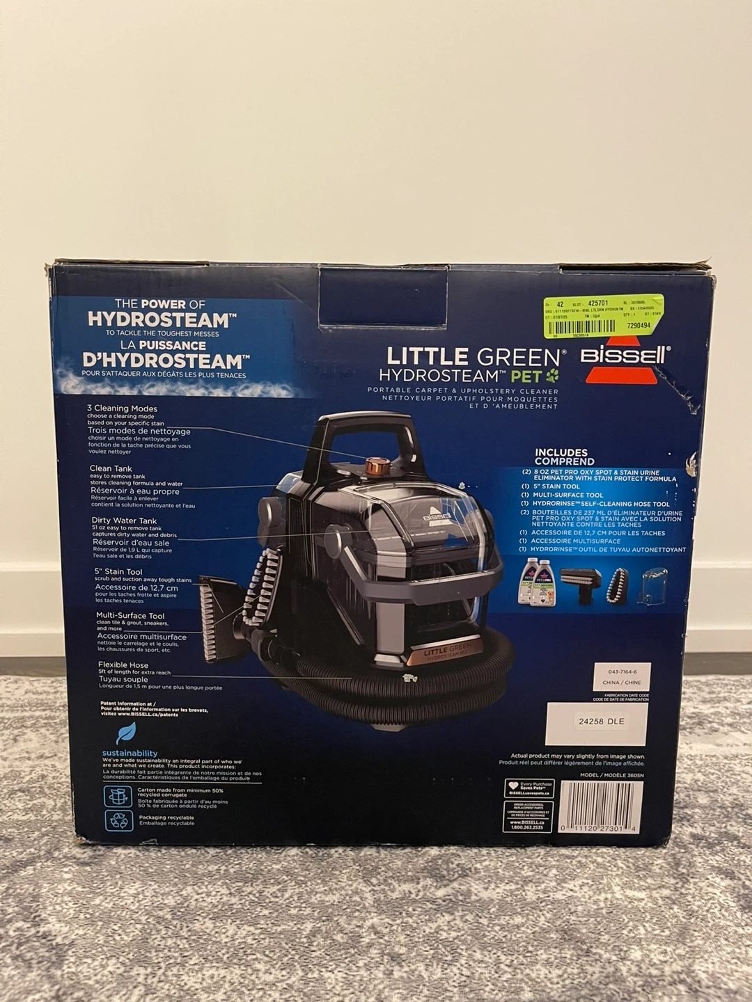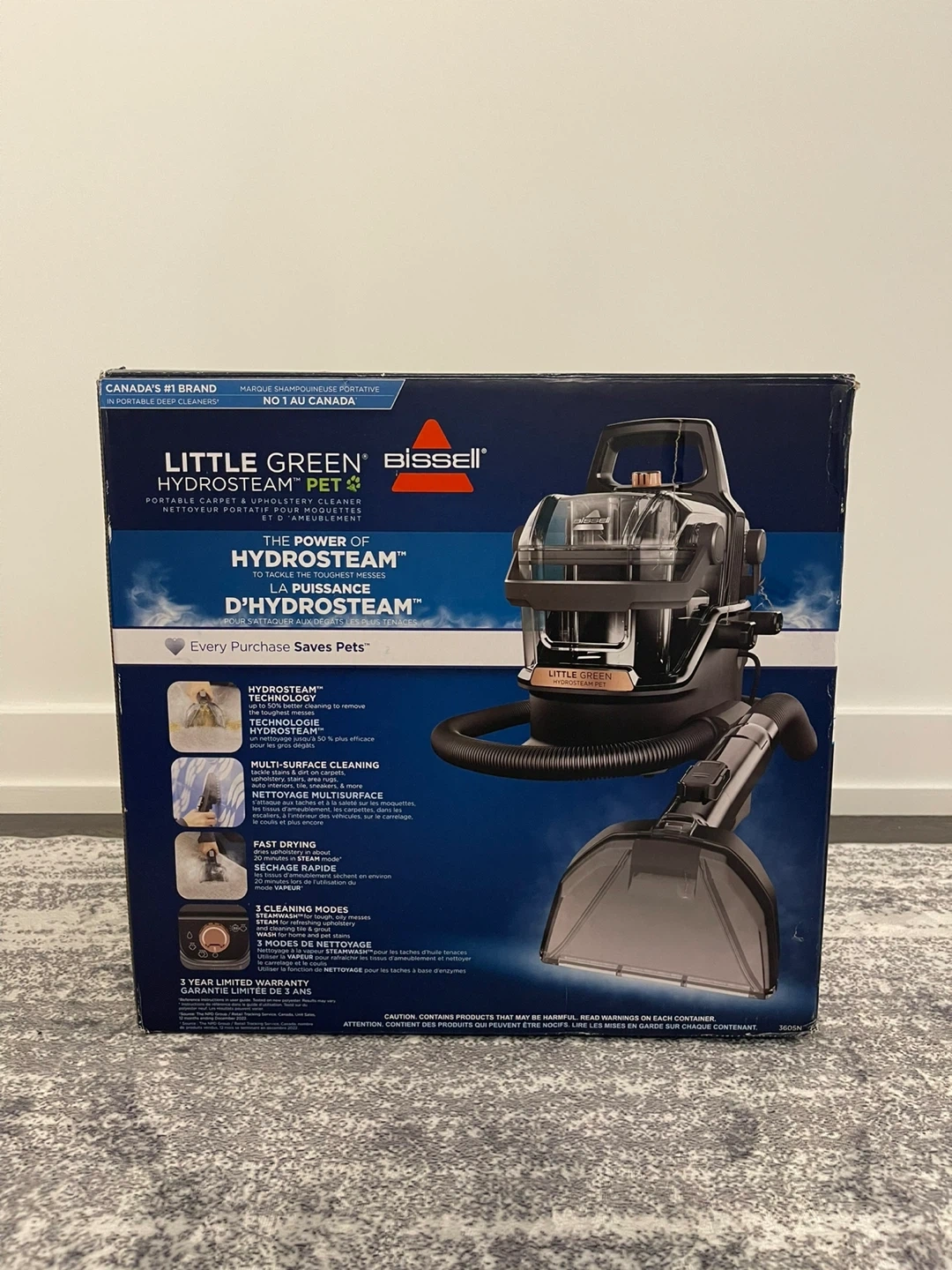 Selling a new Bissell Little Green HydroSteam Pet portable carpet and upholstery cleaner! It's perfect for tackling those tough pet messes and everyday stains. It also works great for car carpets and can be used as a detailing extractor and steam cleaner. Key features: - HydroSteam technology for removing tough stains - Multi-surface cleaning for carpets, upholstery, and more - Fast drying in about 30 minutes - 3 cleaning modes to suit your needs Includes: - 2 stain trapper tool spot & stain urine formula - 3" stain tool - Multi-surface tool - HydroSteam tool for autottonne Price is negotiable.