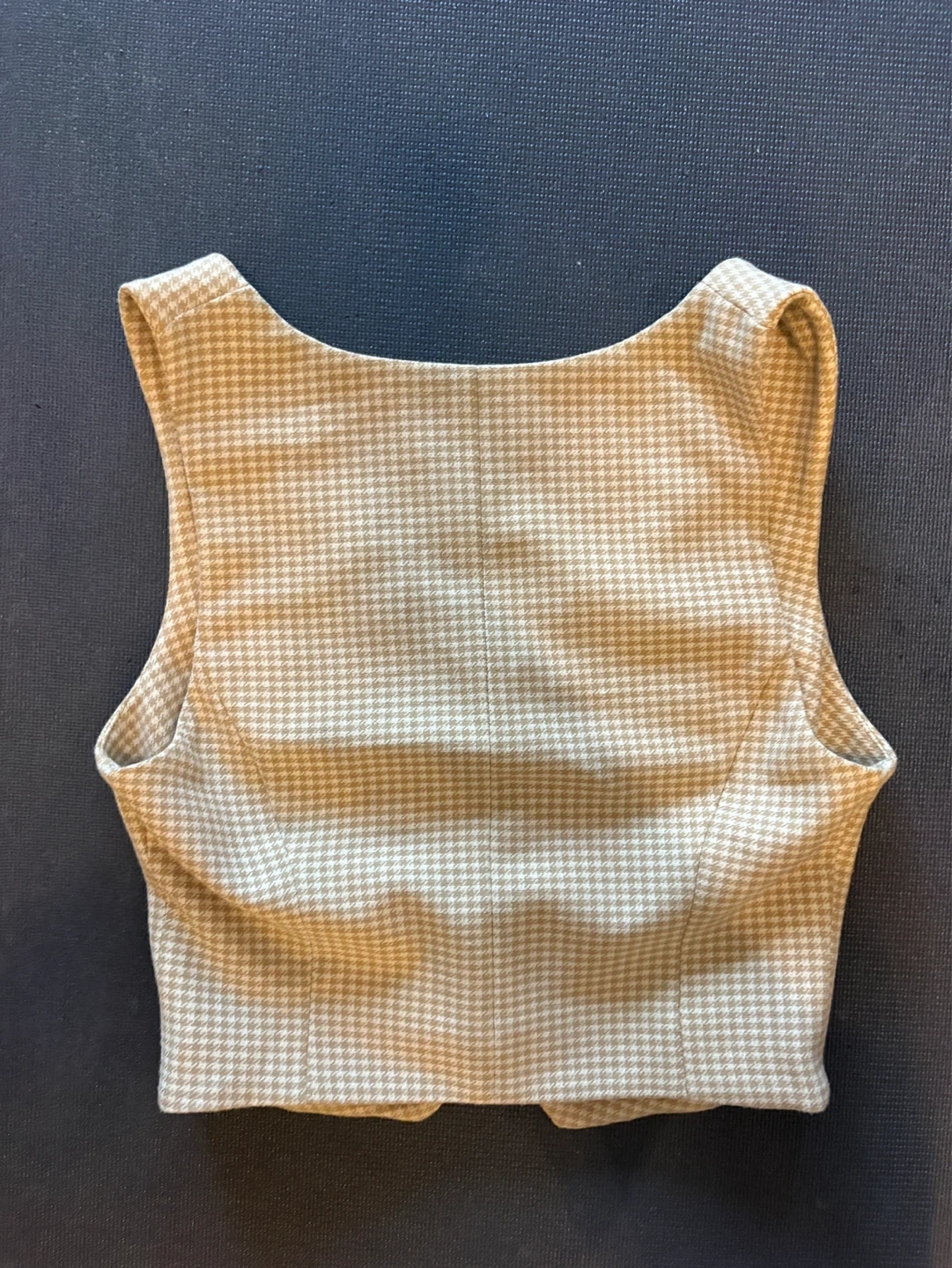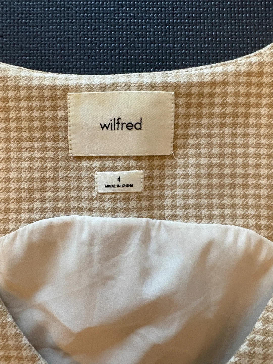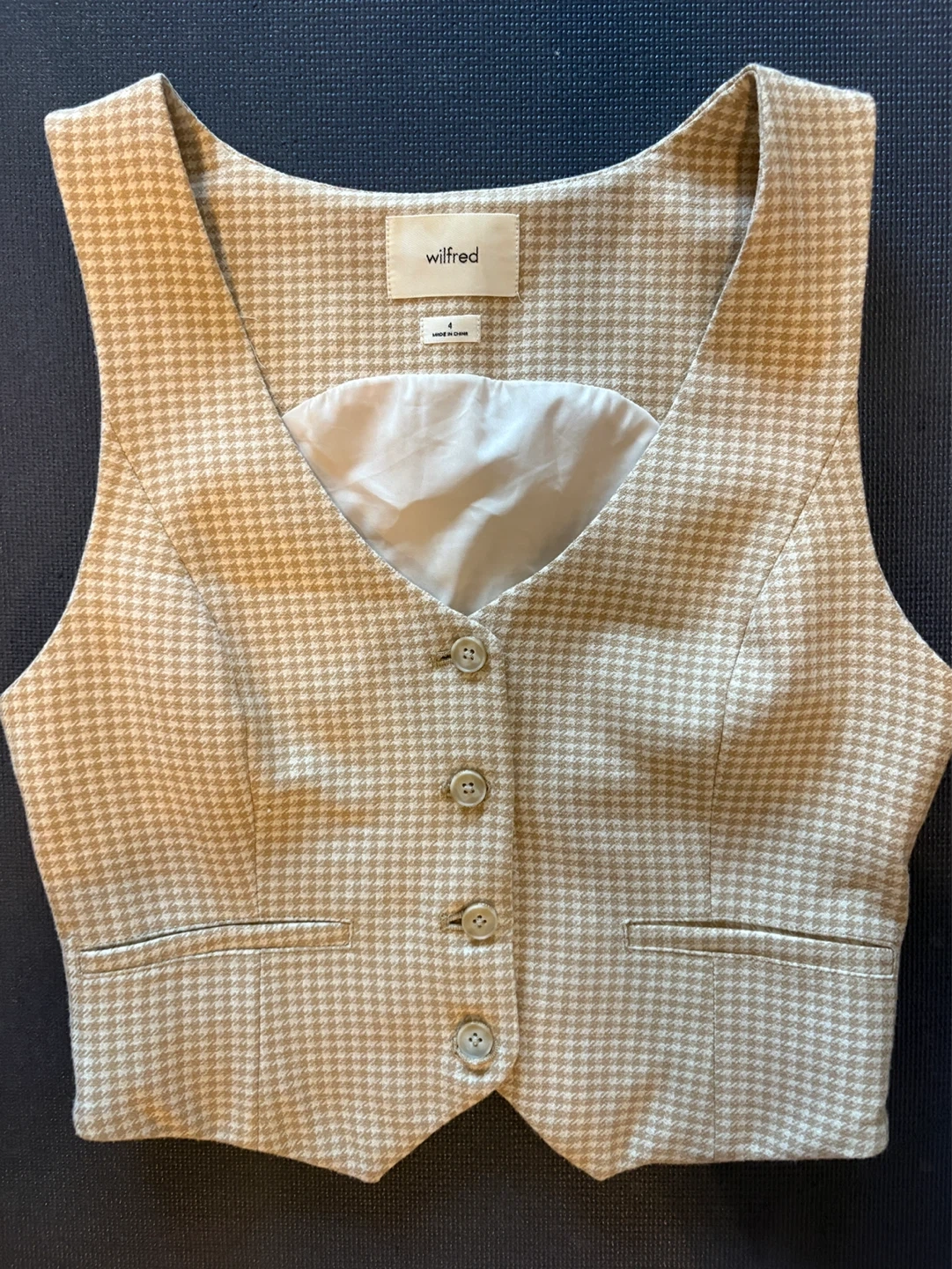 This is a Wilfred vest in a classic houndstooth pattern. It's a size 4 with a button-up front and two faux pockets. Fully lined interior.