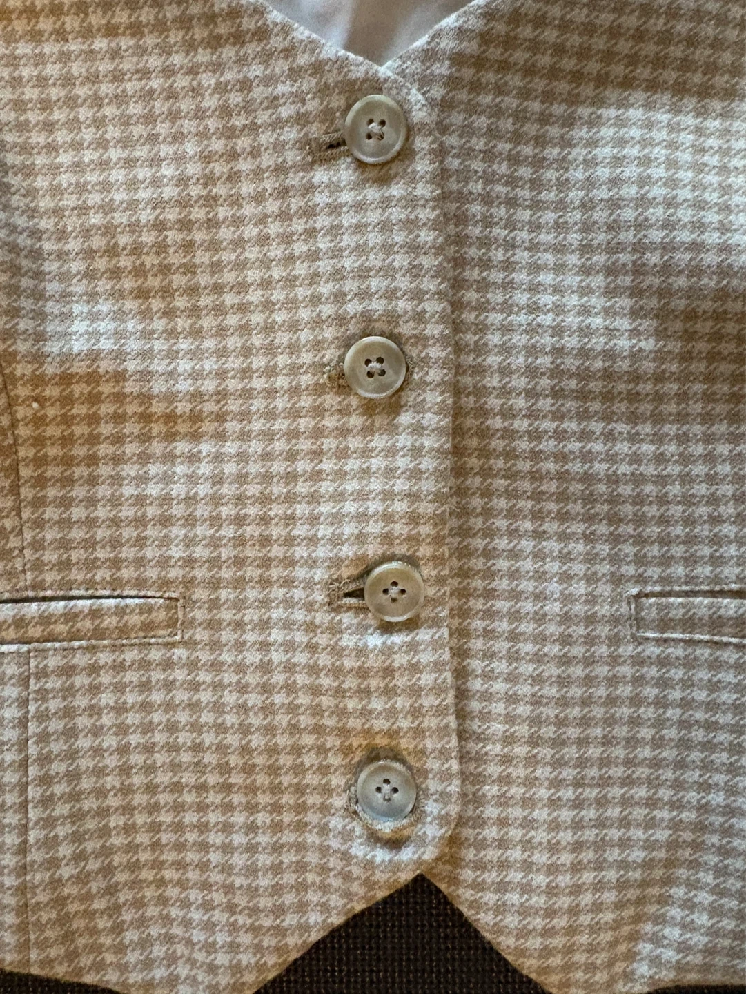 This is a Wilfred vest in a classic houndstooth pattern. It's a size 4 with a button-up front and two faux pockets. Fully lined interior.