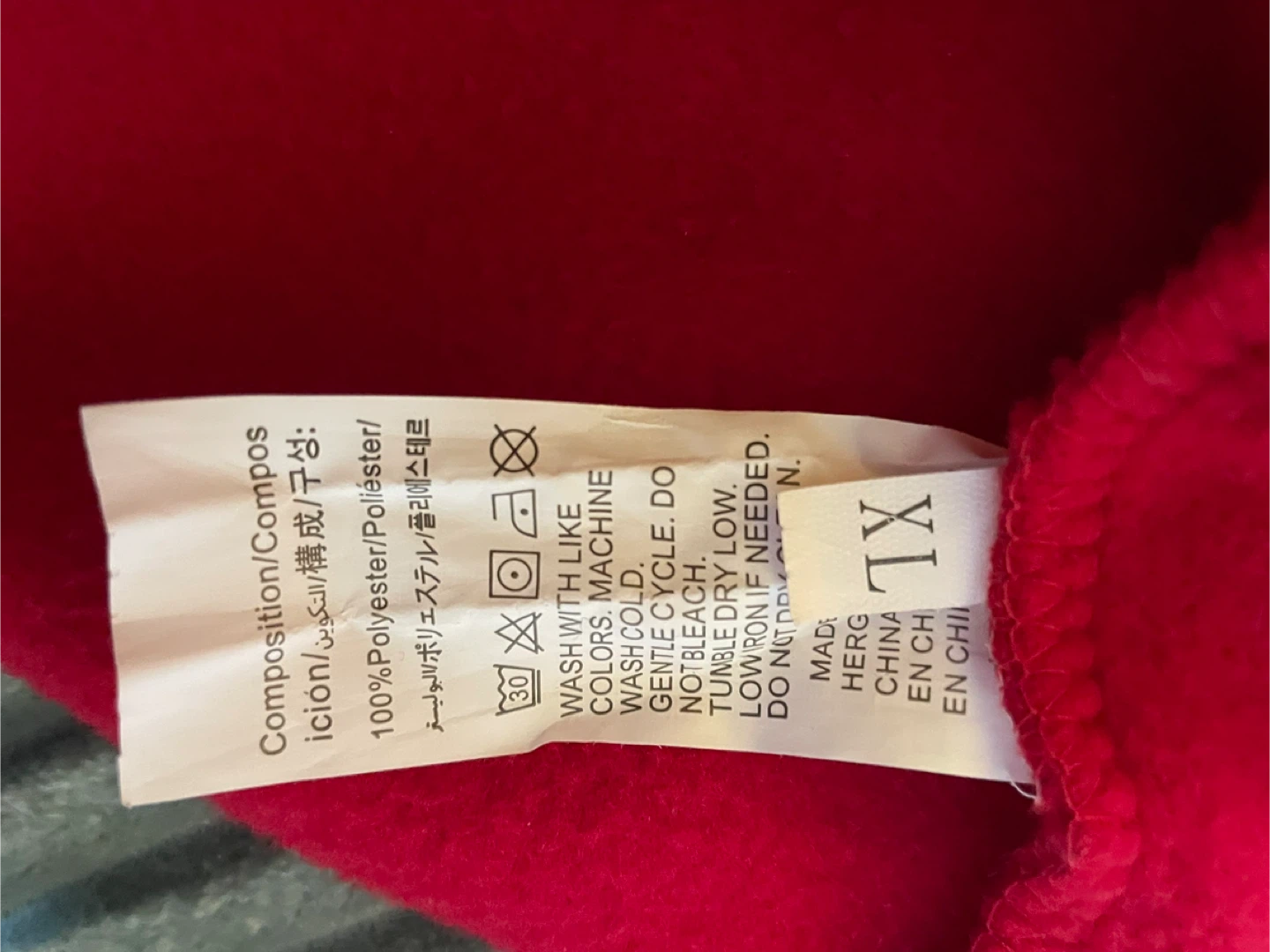 It's a red crewneck sweatshirt with a white feather and heart graphic. Made of 100% polyester. Size is extra large.