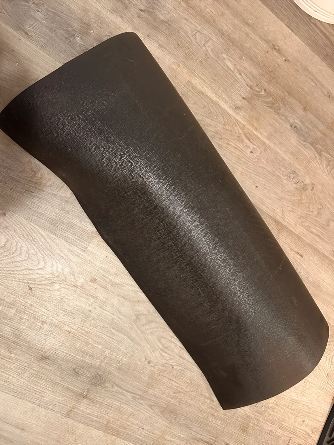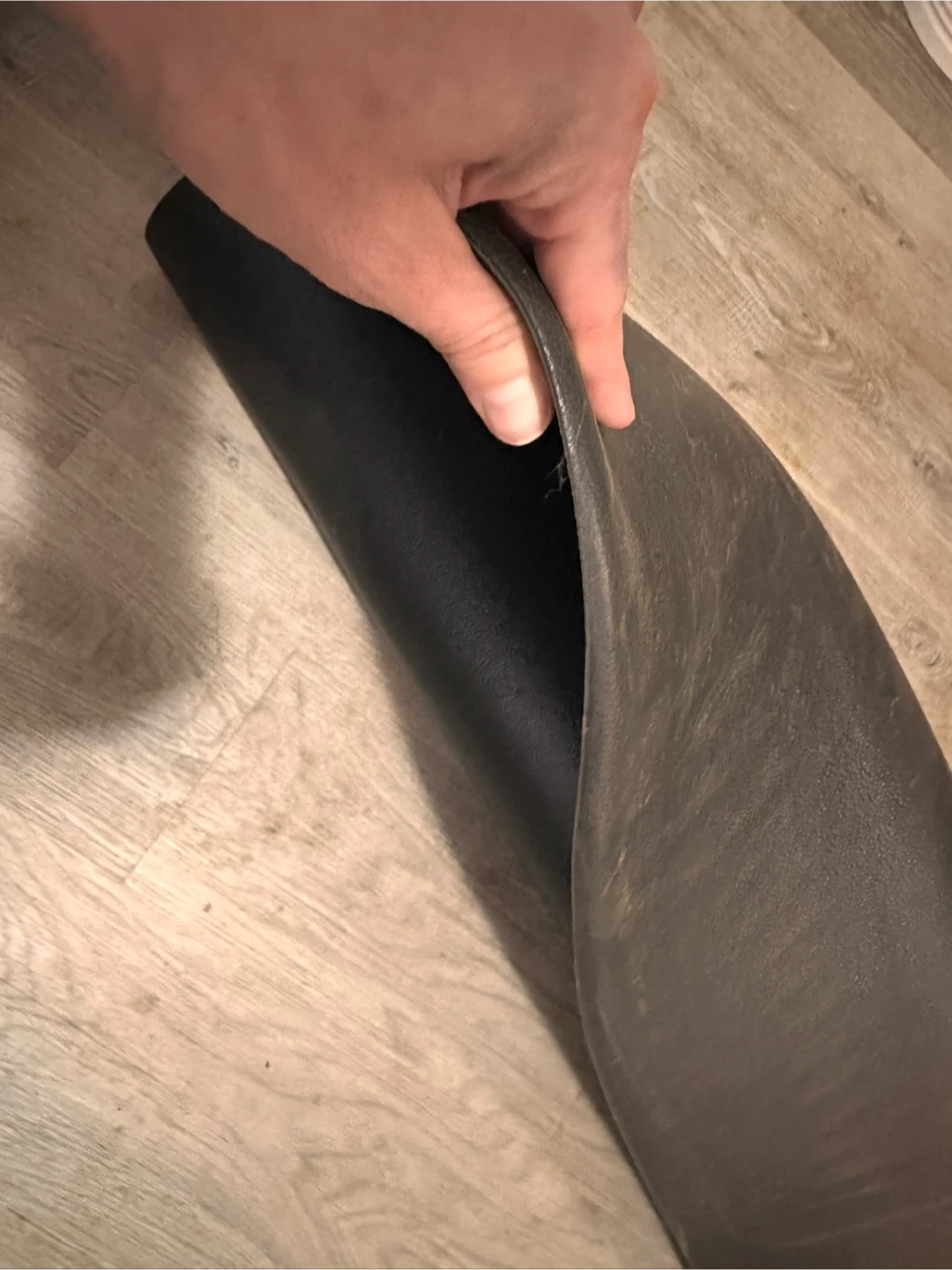 This is a dark grey rubber floor mat, rolled up for storage. It's a durable mat suitable for under various heavy gym equipment. It provides a protective layer for floors.