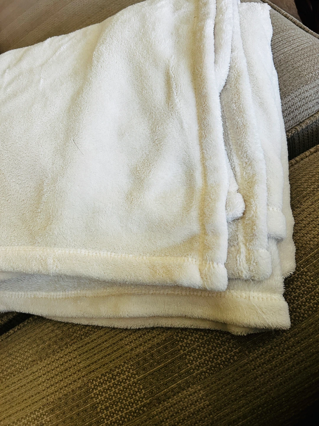 Soft and cozy cream-coloured throw blanket. It's made from a plush material. Perfect for adding warmth on a chilly evening!