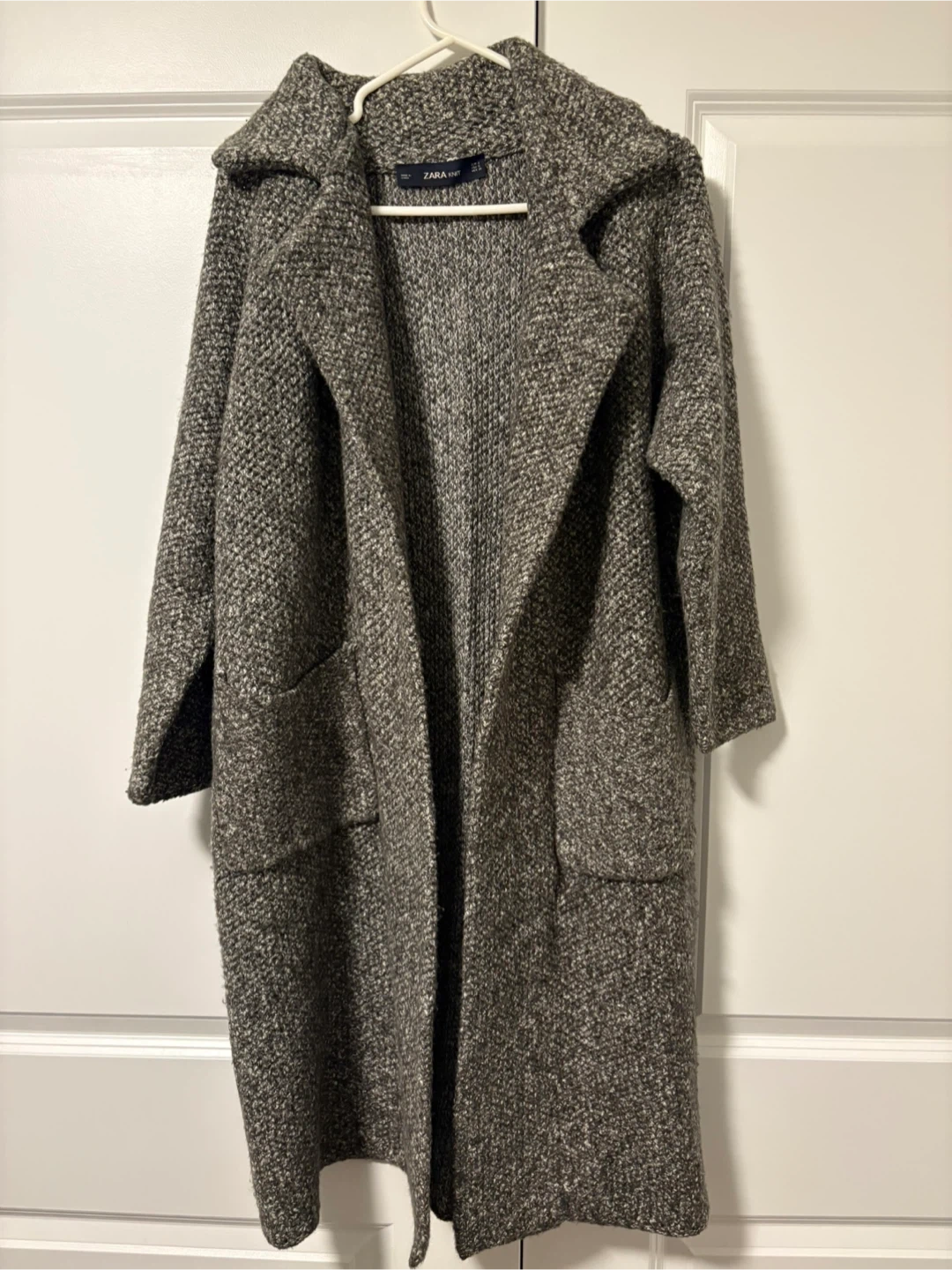 ZARA knit long cardigan in a speckled grey and black pattern. It features a shawl collar and two front pockets. Material is a cozy knit blend.