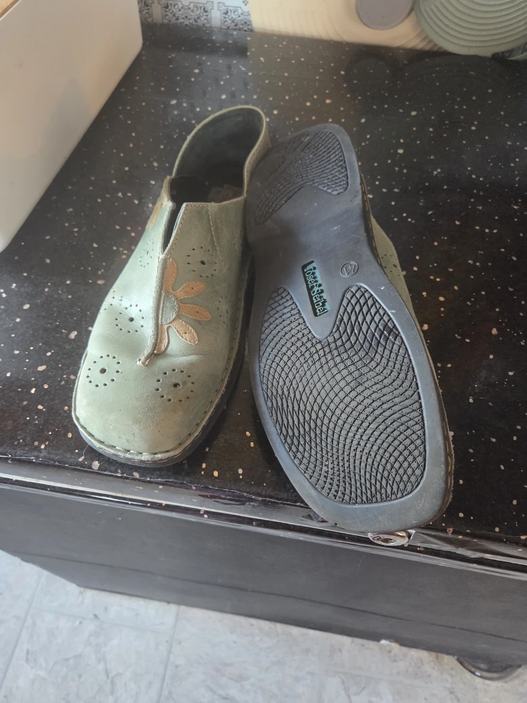 Josef Seibel women's slip-on shoes in a light green colour. They feature decorative cut-out details and a floral accent on the toe. The outsole is black rubber with good tread. These shoes are size 41.