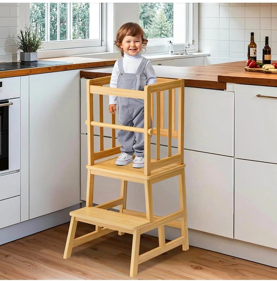 COSYLAND Kitchen Nursery Step Stool for Kids,Solid Bamboo Toddlers Standing Tower with Removable Safety Rail,Large Standing Tower for Kitchen Counter, Kids Learning Stool Natural Bamboo Finish