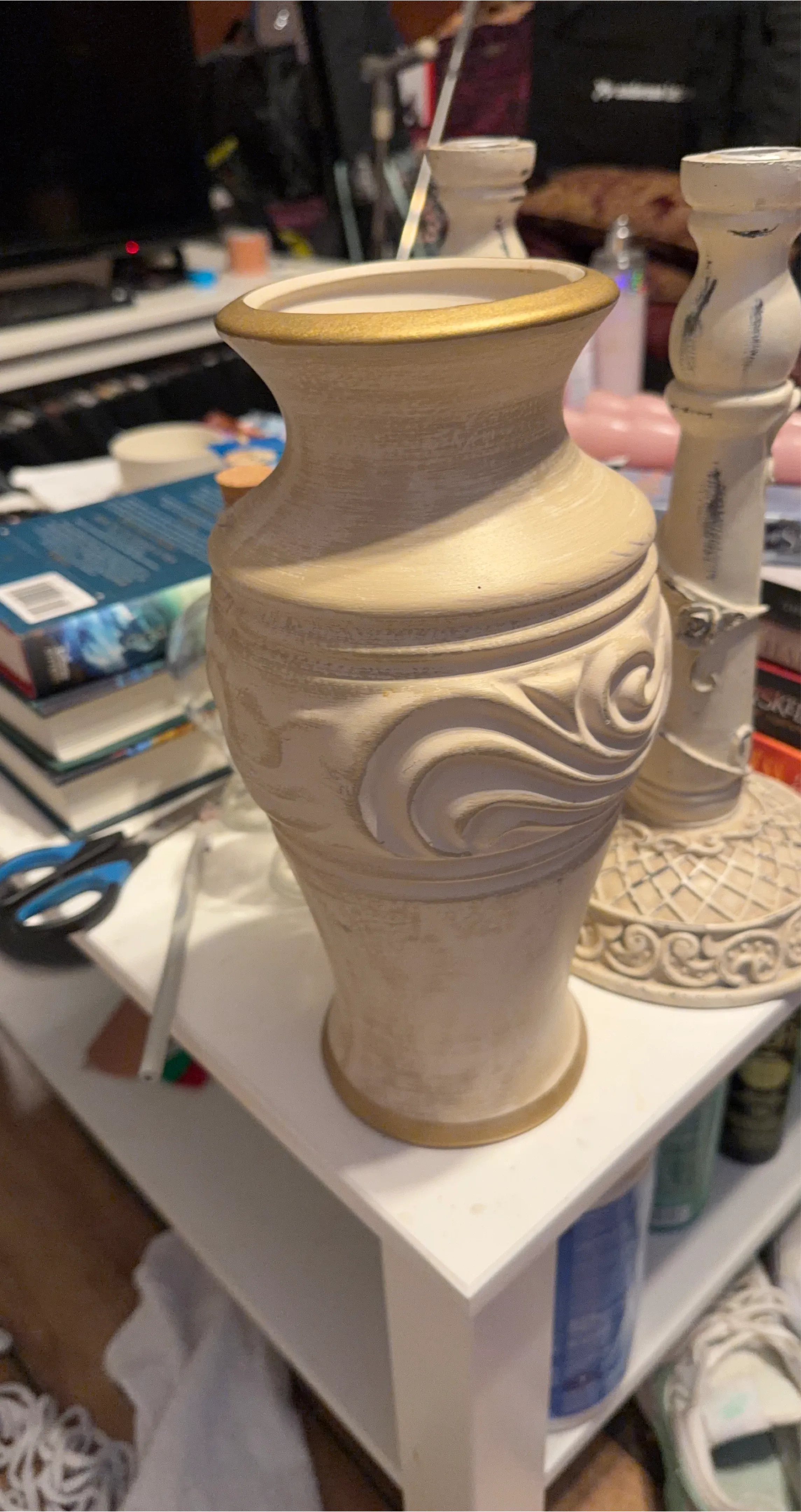 This beige vase features a decorative embossed swirl pattern with a gold trim around the opening and base. It's made of a sturdy material, likely ceramic or resin. Its classic design makes it a lovely accent piece for shelves or tabletops.