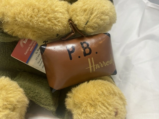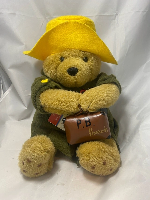 Discover the charm of Paddington Bear with this coveted Harrods London plush, a must-have for collectors and fans alike. Dressed in his iconic yellow hat and green jacket, this 9.5-inch bear boasts a warm brown coat and mischievous black eyes that capture the essence of the beloved character. Made by Rainbow Designs in 2001, this special edition Paddington is an adorable representation of the classic franchise. Complete with his original jacket and measuring 13 inches in length, this plush bear is a vintage treasure. He is part of the exclusive Harrods London collection, adding a touch of luxury to his appeal. Whether for display or as a cherished plaything, this Paddington Bear is an endearing addition to any collection.