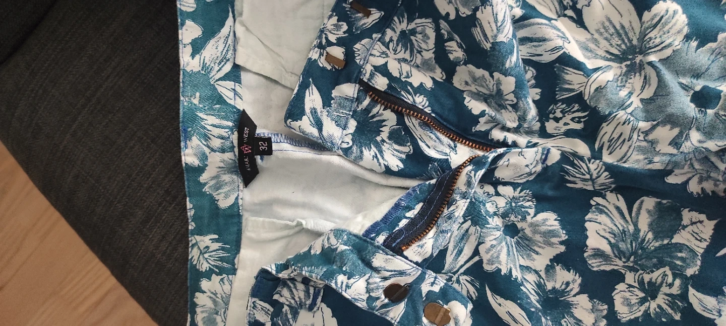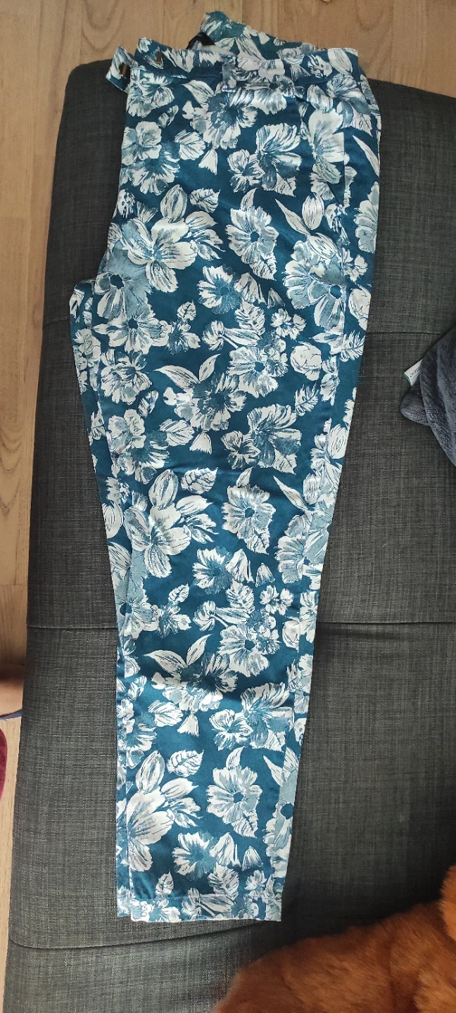 These pants feature a striking teal and white floral print. They have a zipper closure and a size tag indicating 32. Pants are made of a light fabric, suitable for warmer weather.