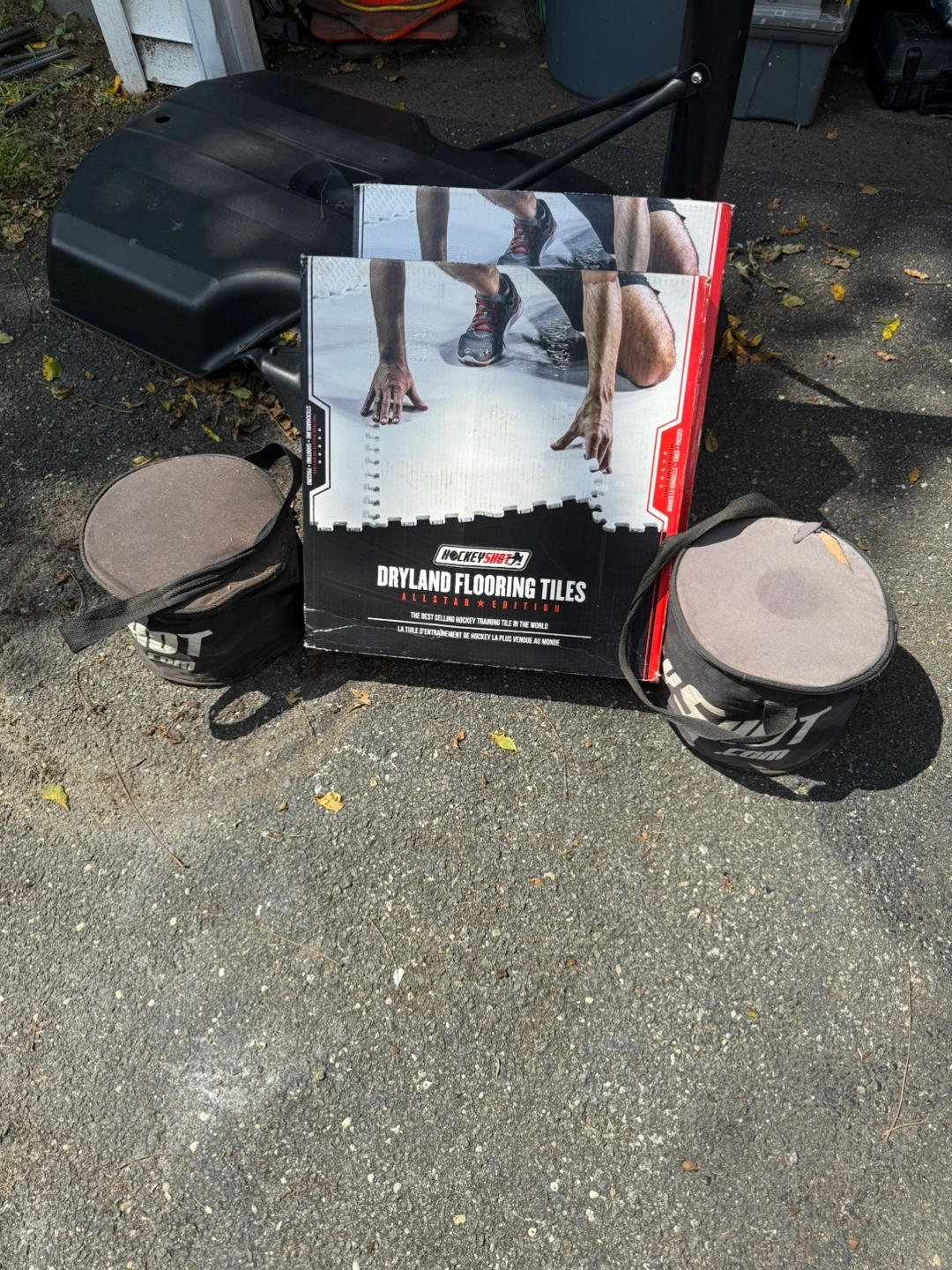 Selling a set of HockeyShot Dryland Flooring Tiles along with a balance board. The tiles are 18" x 18" and designed to have fewer seams for a smoother surface. They're weather-proofed for indoor or outdoor use. Great for hockey training! Plus much more, ice hockey pucks and hockey passer separate selling ice hockey net for 100$