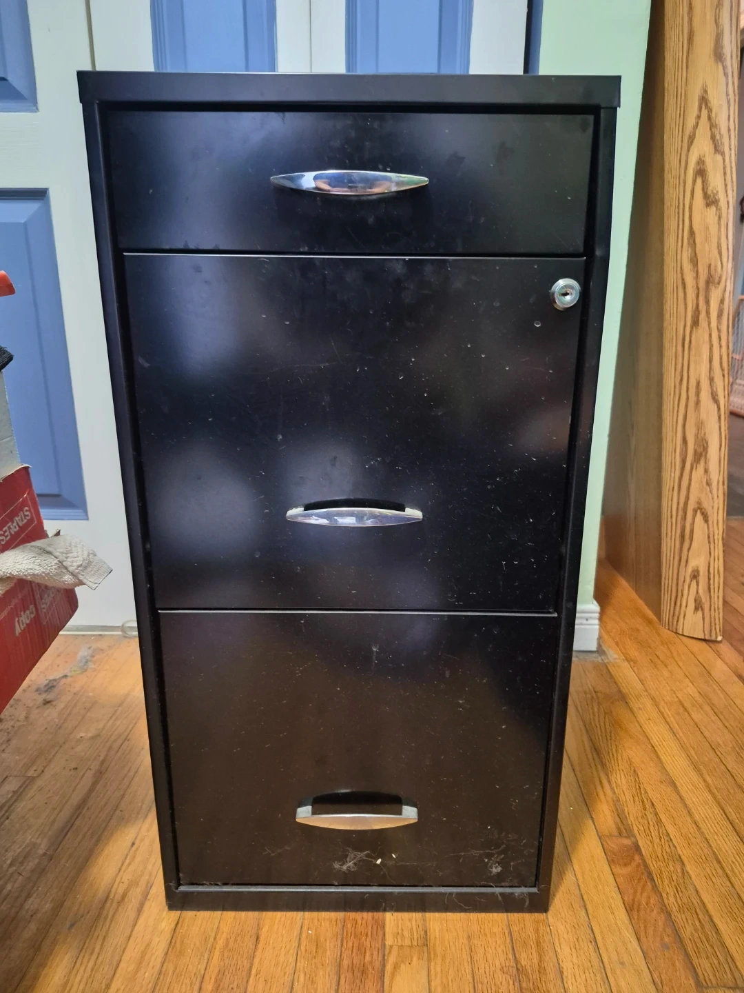 Selling a black three-drawer filing cabinet. It has sleek metal handles and a lock on the top drawer for security. Perfect for organizing your office space!